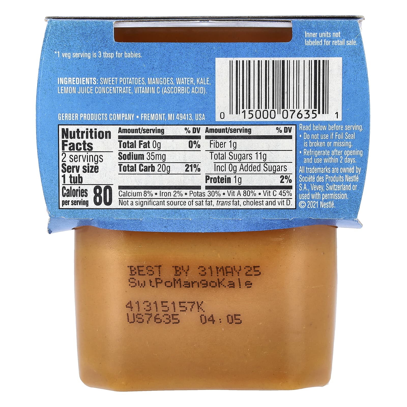 Батат, манго, вода, капуста кудрявая, концентрат лимонного сока, витамин С (аскорбиновая кислота).