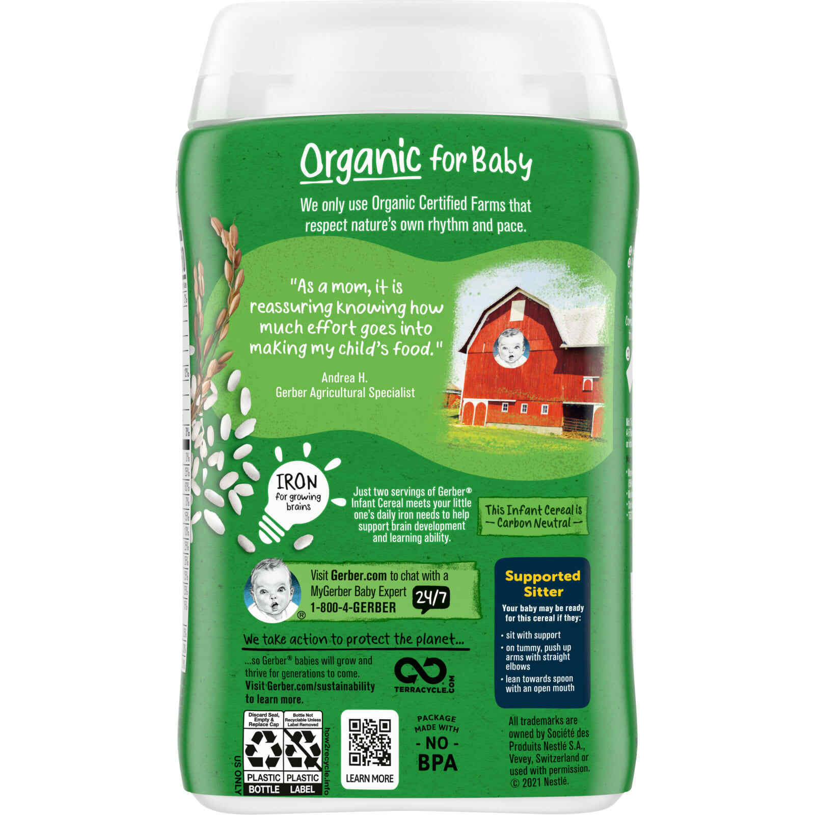 Всего две порции хлопьев для младенцев Gerber® удовлетворят ежедневную потребность вашего малыша в железе, чтобы помочь развитию мозга и способности к обучению.
