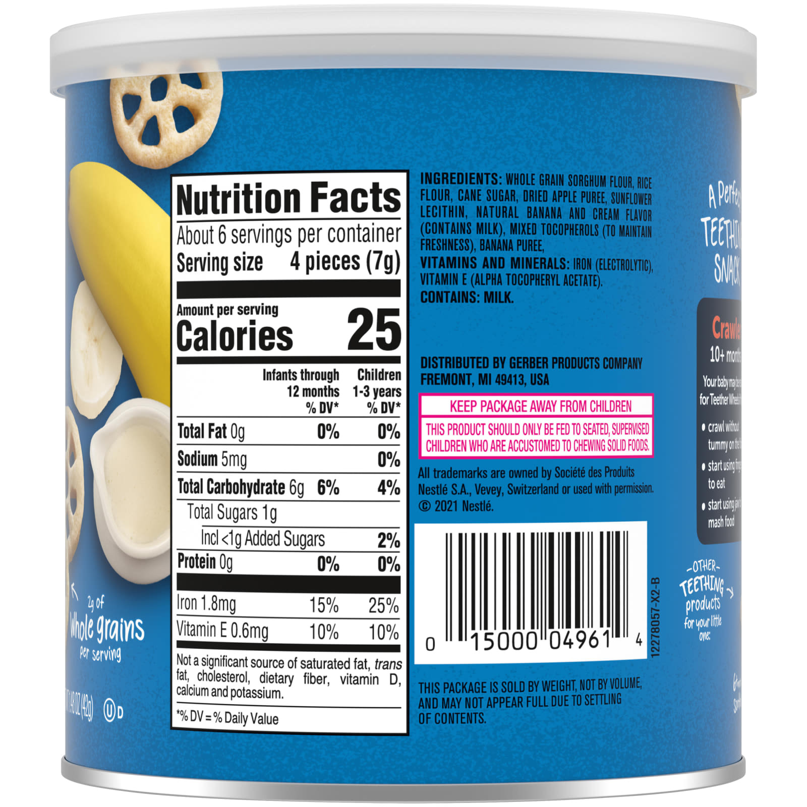 Цельнозерновая мука из сорго, рисовая мука, тростниковый сахар, сухое яблочное пюре, подсолнечный лецитин, натуральный ароматизатор «банан и сливки» (содержит молоко), смешанные токоферолы (для сохранения свежести), банановое пюре. Витамины и минералы: железо (электролитическое), витамин E (альфа-токоферилацетат).