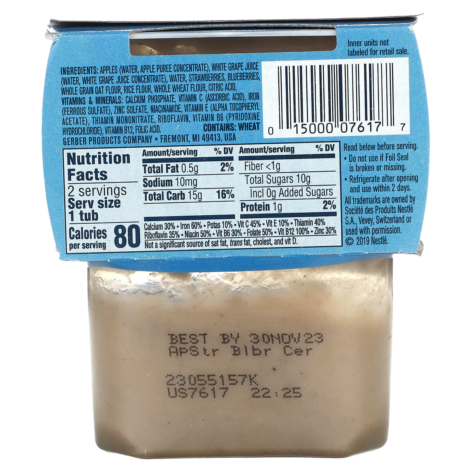 Яблоки (вода, концентрат яблочного пюре), сок белого винограда (вода, концентрат сока белого винограда), вода, клубника, голубика, цельнозерновая овсяная мука, рисовая мука, цельнозерновая пшеничная мука, лимонная кислота, витамины и минералы: фосфат кальция, витамин С (аскорбиновая кислота), железо (сульфат железа), сульфат цинка, никотинамид, витамин Е (альфа-токоферилацетат), мононитрат тиамина, рибофлавин, витамин В6 (пиридоксина гидрохлорид), витамин В12, фолиевая кислота.