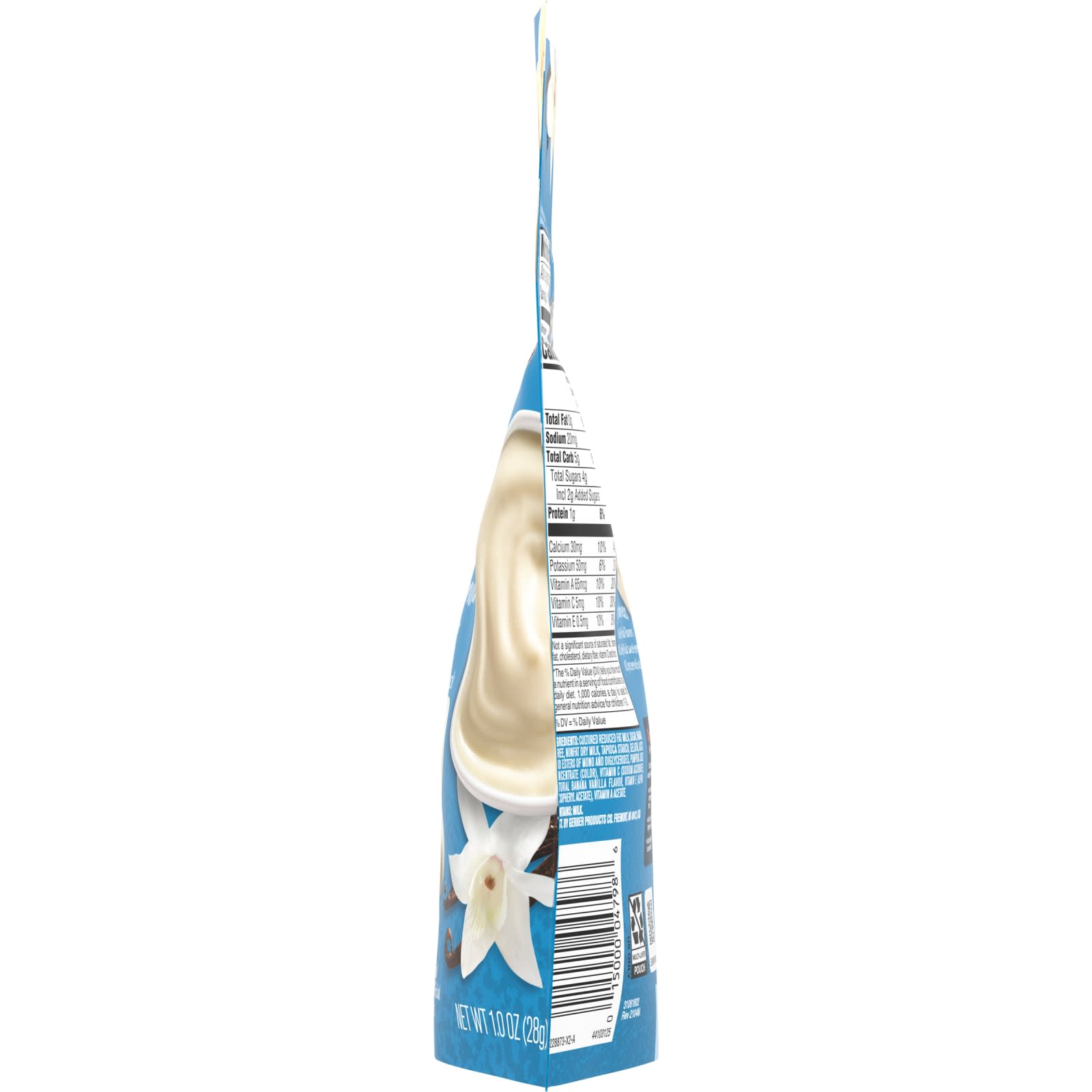 Сквашенное обезжиренное молоко, сахар, банановое пюре, обезжиренное сухое молоко, тапиоковый крахмал, менее 1,5%: желатин, молочная кислота, сложные эфиры моно- и диглицеридов, овощной сок (краситель), витамин С (аскорбат натрия), натуральный бананово-ванильный ароматизатор, витамин E, (альфа-токоферилацетат), ацетат витамина A.