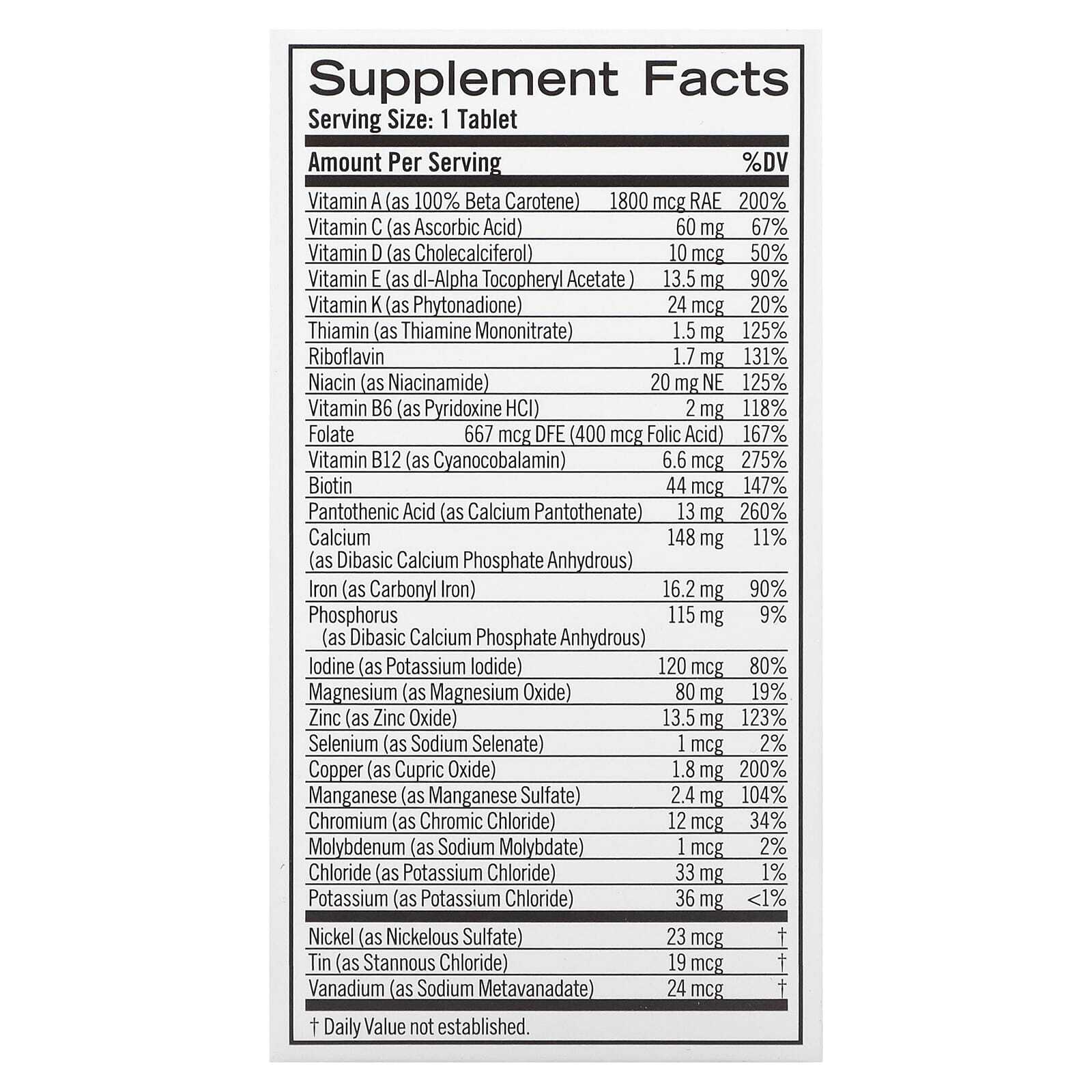 Микрокристаллическая целлюлоза, желатина, стеариновая кислота, кросповидон, дикальций фосфат, сахароза, гипромеллоза, крахмал, полидекстроза, дрожжи с высоким содержанием кремния, краситель красный 40 лак FD&C, тальк, диоксид кремния, стеарат магния, маннит, триглицериды, токоферолы, полиэтиленгликоль, минерального масла, аскорбат натрия, диоксид титана, трикальцийфосфат, краситель синий 2 лак FD&C, бензоат натрия (консервант), сорбиновая кислота, аскорбил пальмитат и карнаубский воск.