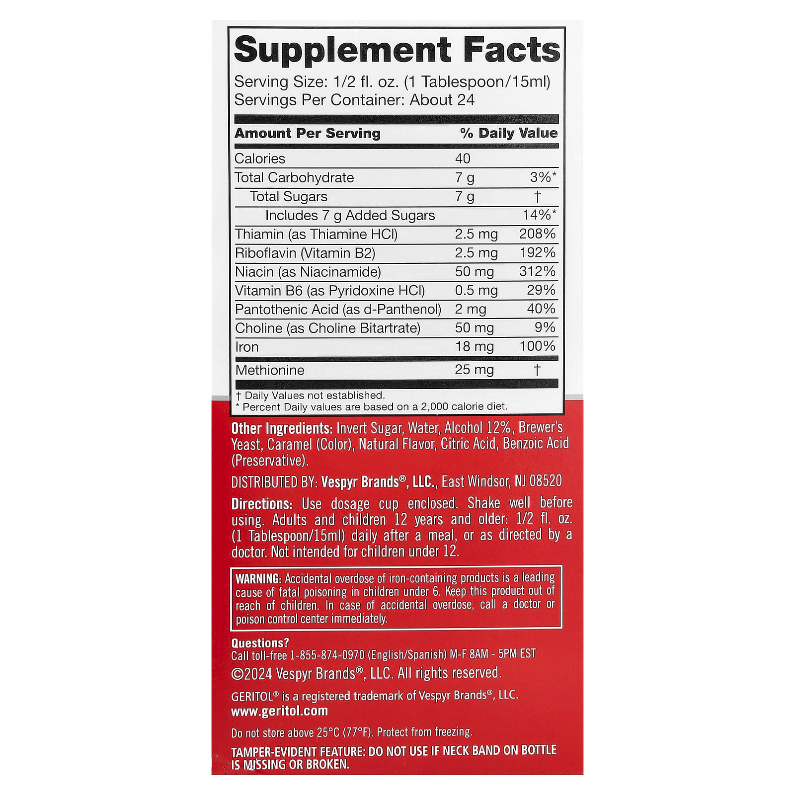Geritol Liquid — это уникальное средство, специально разработанное для содержания высокоэффективных витаминов B1, B2, B3 и железа для восполнения запаса необходимых питательных веществ и поддержки организма.