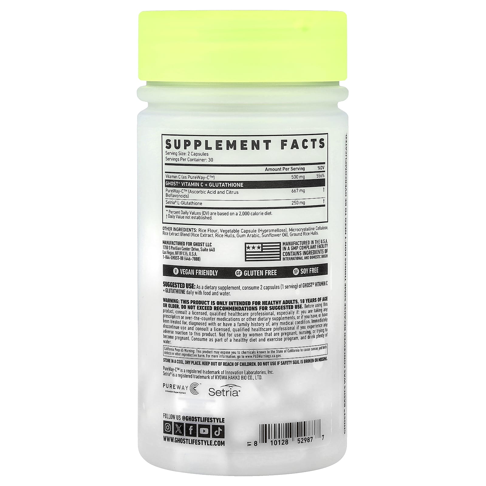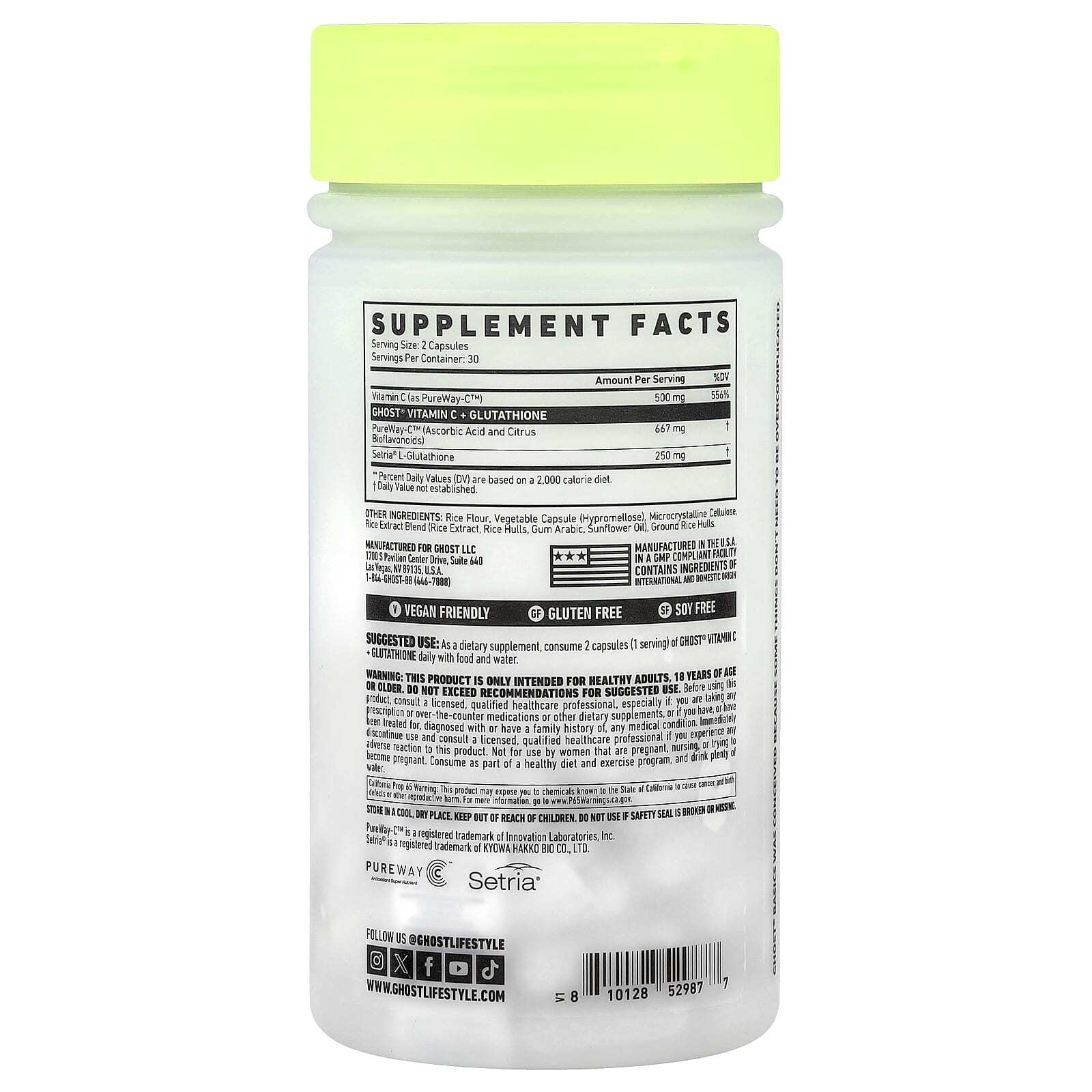 В качестве пищевой добавки принимайте по 2 капсулы (1 порция) витамина С Ghost® и глутатиона в день во время еды и воды.