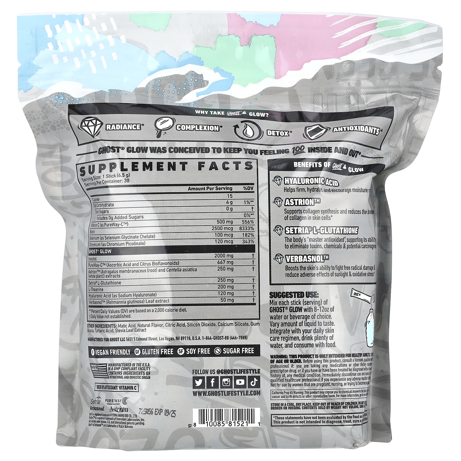 Смешайте каждый стик (порцию) GHOST® GLOW с 8–12 унциями воды или напитка по выбору. Варьируйте количество жидкости по вкусу. Включите в свой ежедневный режим ухода за кожей, пейте много воды и употребляйте во время еды.