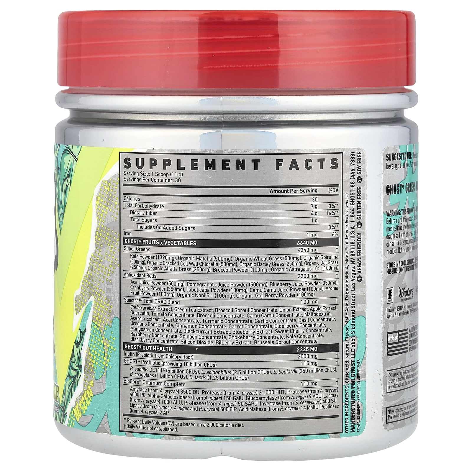 Добывать фрукты и овощи здесь просто как никогда! GHOST® GREENS сочетает в себе 19 зеленых и красных оттенков, полученных из отдельных источников, с полной дозой Spectra ™, пребиотиками, 10 млрд КОЕ и супер-премиальными комплексными пищеварительными ферментами BioCore®.