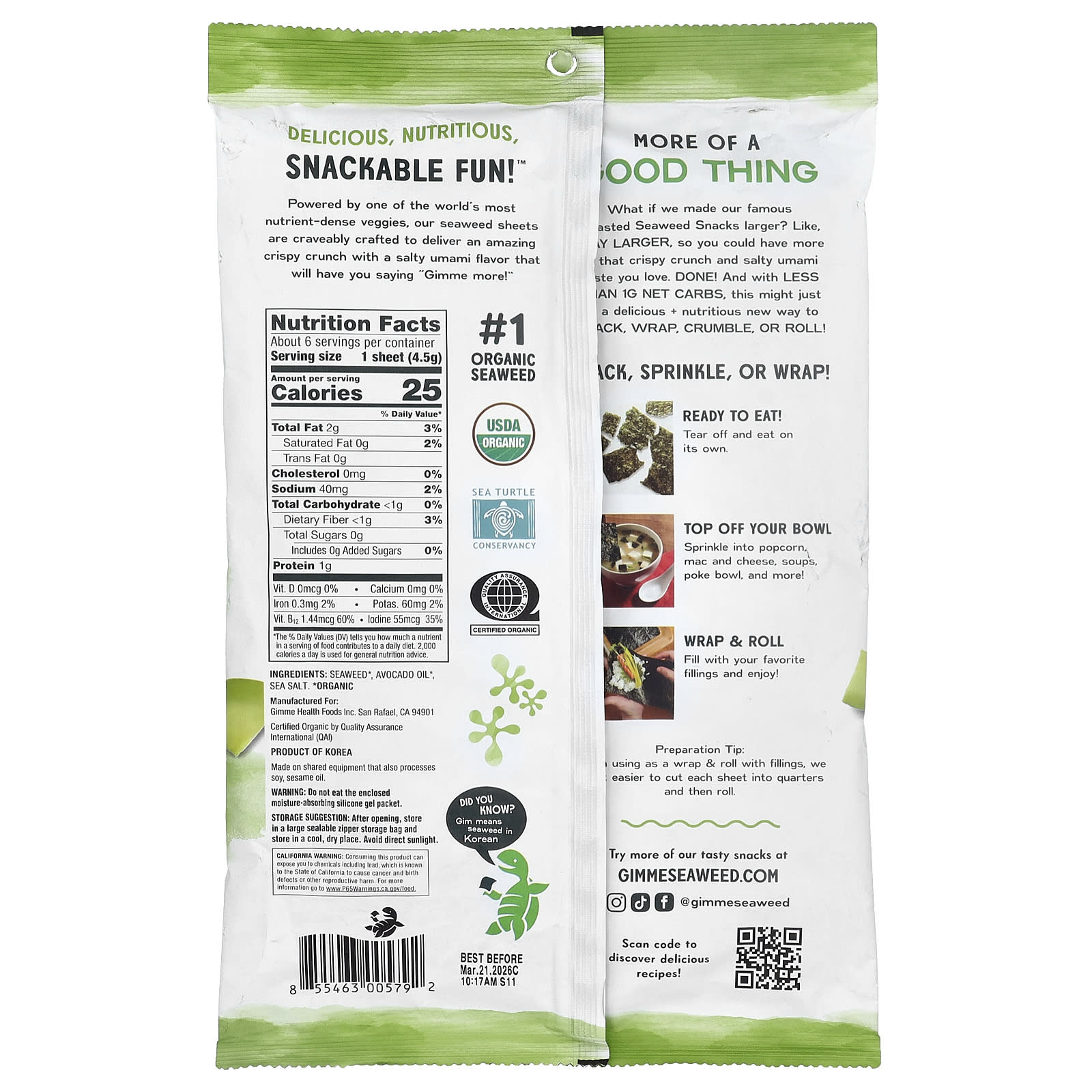 Что, если мы увеличим размер наших знаменитых снеков из обжаренных морских водорослей? Мы сделаем их больше, чтобы вы могли дольше наслаждаться хрустящей корочкой и соленым вкусом умами, которые вы так любите. Готово! Благодаря содержанию менее 1 г чистых углеводов эти водоросли могут стать восхитительным и питательным перекусом, а также ими можно обернуть другие блюда или раскрошить и посыпать.