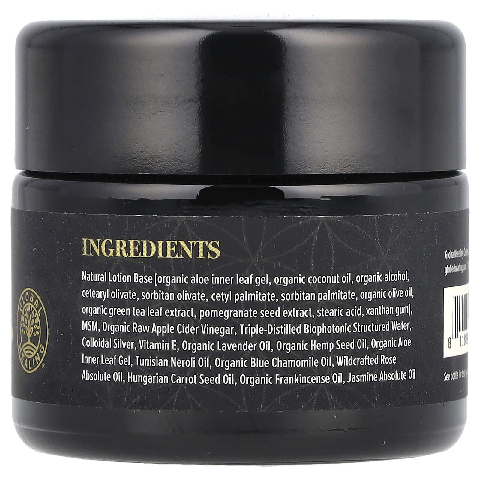 Натуральная основа лосьона [гель из внутренней части листьев органического алоэ, органическое кокосовое масло, органический спирт, цетеарил оливат, сорбитан оливат, цетил пальмитат, сорбитан пальмитат, органическое оливковое масло, органический экстракт листьев зеленого чая, экстракт гранатовых зерен, стеариновая кислота, ксантановая камедь], метилсульфонилметан, органический необработанный яблочный уксус, структурированная вода тройной дистилляции с помощью био фотоники, коллоидное серебро, витамин E, органическое лавандовое масло, органическое конопляное масло, гель из внутренней части листа органического алоэ вера, масло тунисской нероли, масло из органической голубой ромашки, масло из натуральной дикорастущей розы, масло из семян венгерской моркови, органическое ладановое масло, масло жасмина.