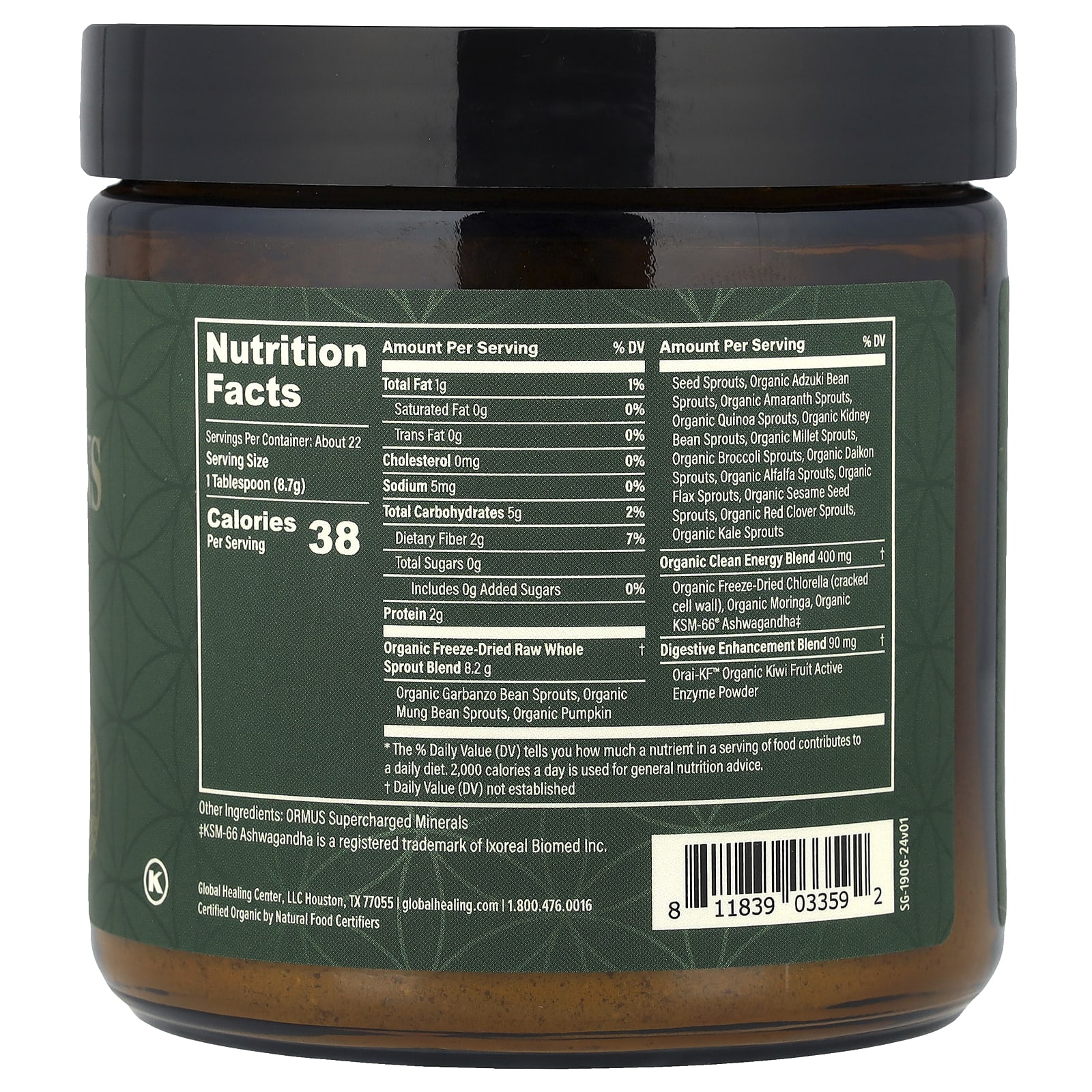 | Органическая смесь чистой энергии Органическая сублимированная хлорелла (с потрескавшейся клеточной стенкой), органическая моринга, органический KSM-66 ашваганда | 400 мг | † |