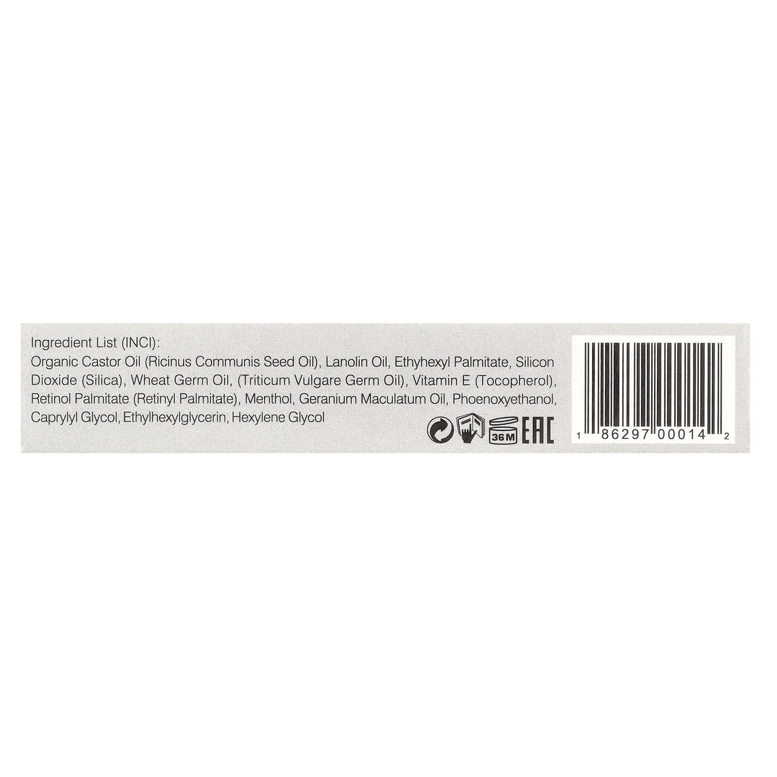 Органическое касторовое масло (масло семян Ricinus communis), ланолиновое масло, этилгексил пальмитат, диоксид кремния, масло из зародышей пшеницы, (масло из ростков арогьяпачи), витамин E (токоферол), ретинола пальмитат (ретинилпальмитат), ментол, масло герани (Geranium maculatum), феноксиэтанол, каприлилгликоль, этилгексилглицерин, гексиленгликоль.