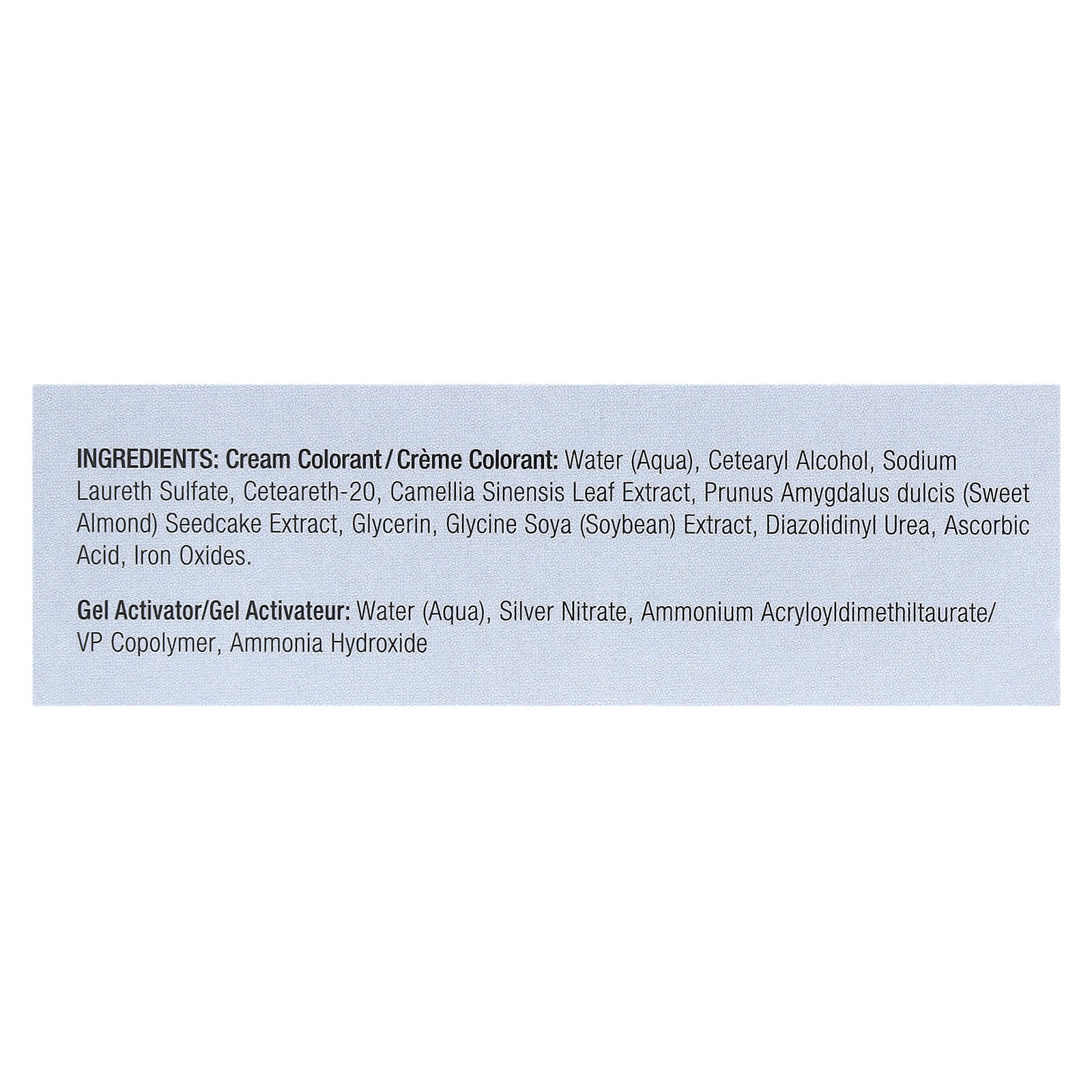Крем-краситель: Вода (Aqua), цетеариловый спирт, лауретсульфат натрия, цетеарет-20, экстракт листьев зеленого чая (Camellia sinensis), экстракт тортов из сладкого миндаля (Prunus amygdalus dulcis), глицерин, экстракт сои (глицина), диазолидинил мочевина, аскорбиновая кислота, оксиды железа.