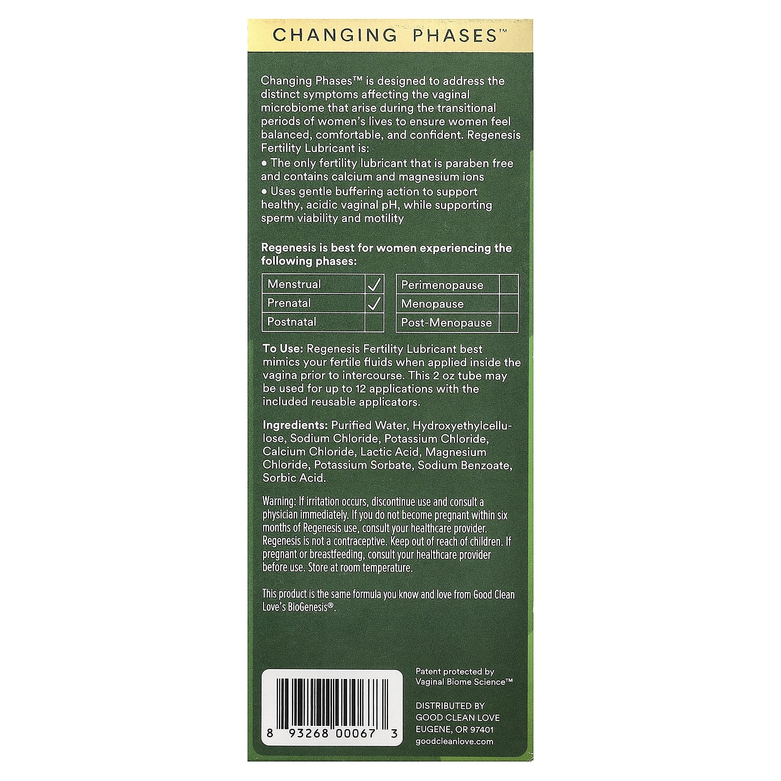 Change Phases™ разработан для устранения отдельных симптомов, влияющих на микробиом влагалища, которые возникают в переходные периоды жизни женщин, чтобы обеспечить уравновешенное, комфортное и уверенность в себе женщин. Смазка Reogenic Fertility