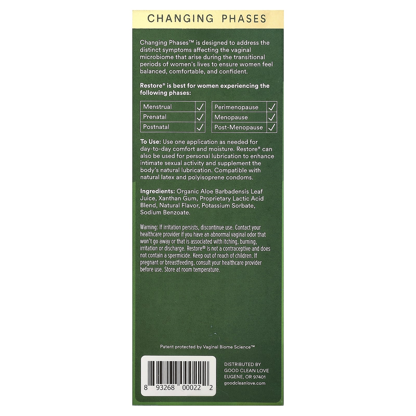 Если раздражение не проходит, прекратите использование. Обратитесь к врачу, если у вас возникает аномальный запах из влагалища, который не проходит или связан с зудом, жжением, раздражением или выделениями. Restore® не является противозачаточным средством и не содержит спермицидов. Хранить в недоступном для детей месте. Перед началом применения во время беременности или кормления грудью следует проконсультироваться с врачом. Хранить при комнатной температуре.