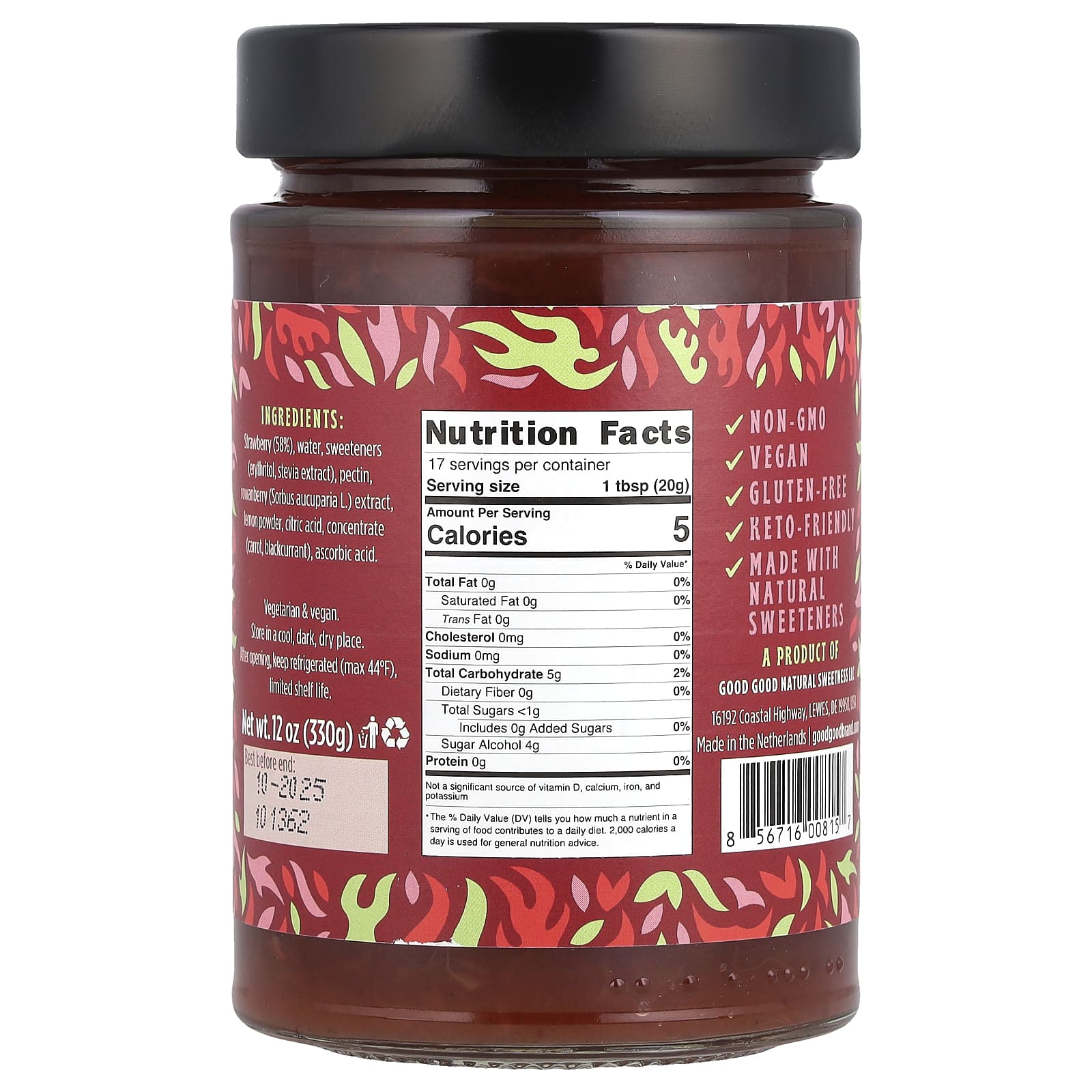 Strawberry (58%), water, sweeteners (erythritol, stevia extract), pectin, rowanberry (sorbus aucuparia L.) extract, lemon powder, citric acid, concentrate (carrot, blackcurrant), ascorbic acid.