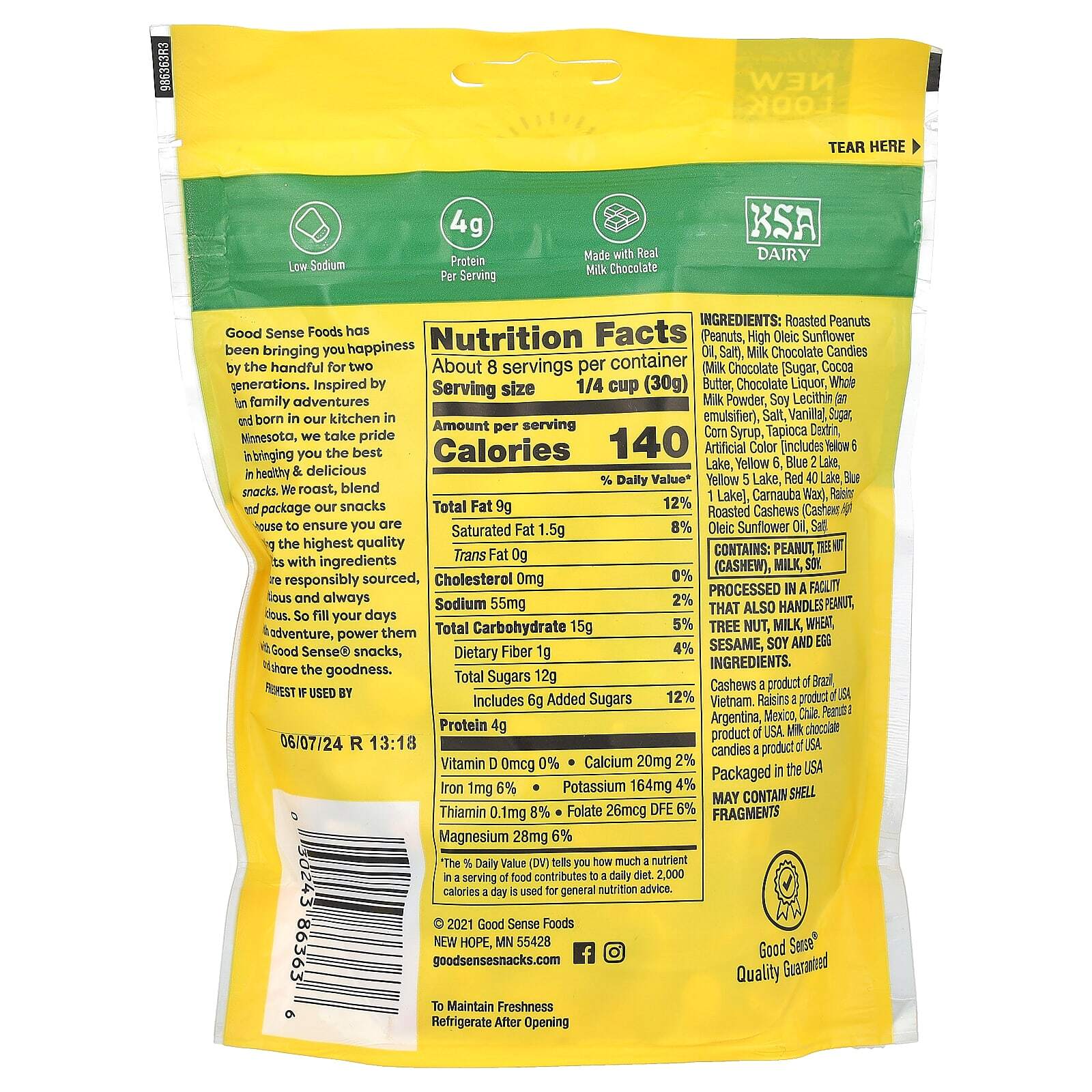 Жареный арахис, подсолнечное масло с высоким содержанием олеина, соль), конфеты из молочного шоколада (молочный шоколад [сахар, какао-масло, тертое какао, сухое цельное молоко, лецитин из сои (эмульгатор), соль, ваниль], сахара, кукурузный сироп, тапиоковый декстрин, искусственный краситель [включает краситель желтый 6 лак, краситель желтый 6, краситель синий 2 лак, краситель желтый 5 лак, краситель красный 40 лак, краситель синий 1 лак], карнаубский воск), изюма, обжаренных кешью (кешью, подсолнечное масло с высоким содержанием олеина, соль).