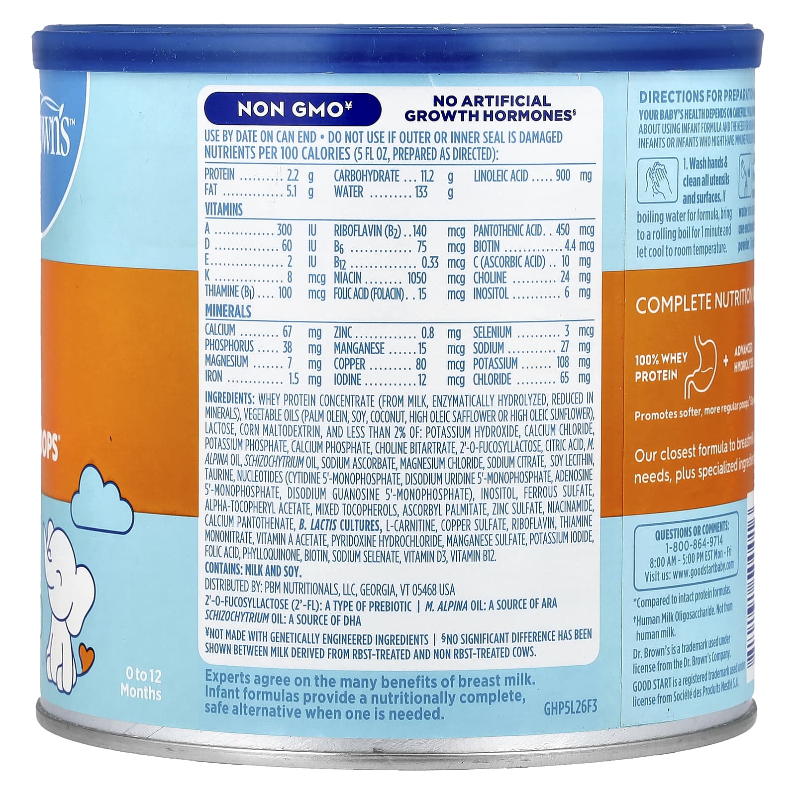 Концентрат сывороточного протеина (из молока, ферментативно гидролизованный, с пониженным содержанием минералов), растительные масла (пальмовый олеин, соя, кокос, высокоолеиновый сафлор или высокоолеиновый подсолнечник), лактоза, кукурузный мальтодекстрин, и менее 2% гидроксида калия, хлорид кальция, фосфат калия, фосфат кальция, битартрат холина, 2'-0-фукозиллактоза, лимонная кислота, м. альпиновое масло, масло шизохитрия, аскорбат натрия, хлорид магния, цитрат натрия, соевый лецитин, таурин, нуклеотиды (цитидин 5'-монофосфат, динатрий уридин 5'-монофосфат, аденозин 5'-монофосфат, динатрий гуанозин 5'-монофосфат), инозитол, сульфат железа, альфа-токоферилацетат, смешанные токоферолы, аскорбил пальмитат., сульфат цинка, никотинамид, пантотенат кальция, б. молочнокислые культуры, L-карнитин, сульфат меди, рибофлавин, тиамина мононитрат, ацетат витамина A, пиридоксина гидрохлорид, сульфат марганца, йодид калия, фолиевая кислота, филлохинон, биотин, селенат натрия, витамин D3, витамин B12.