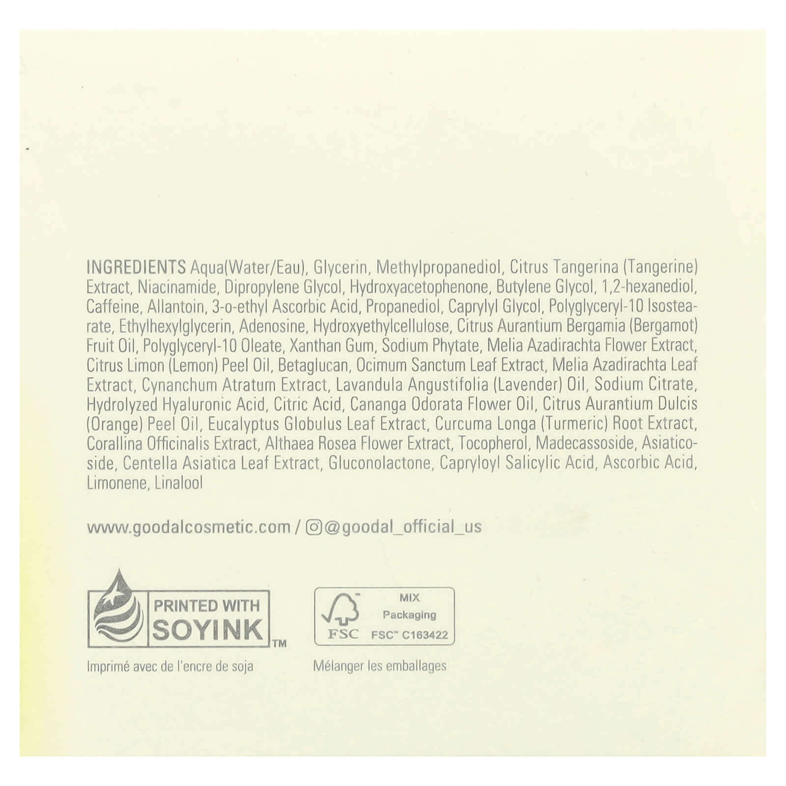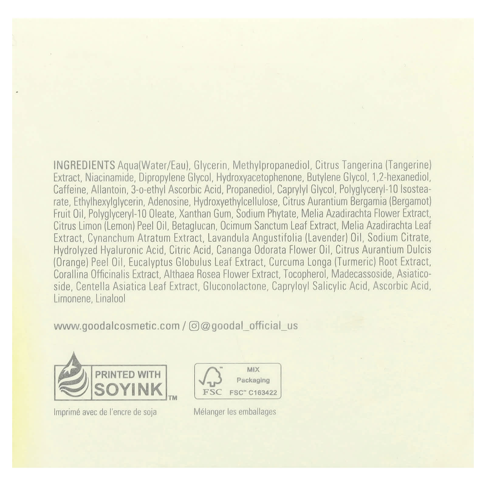 Вода, глицерин, метилпропандиол, экстракт мандарина (Сitrus tangerina), никотинамид, дипропиленгликоль, гидроксиацетофенон, бутиленгликоль, 1,2-гександиол, кофеин, аллантоин, 3-о-этил-аскорбиновая кислота, пропандиол, каприлилгликоль, полиглицерил-10 изостеарат, этилгексилглицерин, аденозин, гидроксиэтилцеллюлоза, масло бергамота (Citrus aurantium bergamia), полиглицерил-10 олеат, ксантановая камедь, фитат натрия, экстракт цветков дерева ним (Melia azadirachta), масло из цедры лимона (Citrus limon), бета-глюкан, экстракт листьев туласи (Ocimum sanctum), экстракт листьев дерева ним (Melia azadirachta), экстракт цинанхума (Cynanchum atratum), лавандовое масло (Lavandula angustifolia), цитрат натрия, гидролизованная гиалуроновая кислота, лимонная кислота, масло из цветков иланг-иланга (Cananga odorata), масло из цедры апельсина (Citrus aurantium dulcis), экстракт листьев эвкалипта шаровидного (Eucalyptus globulus), экстракт корня куркумы (Curcuma longa), экстракт кораллины лекарственной (Corallina officinalis), экстракт цветков штокрозы розовой (Althaea rosea), токоферол, мадекассосид, азиатикозид, экстракт листьев центеллы азиатской, глюконолактон, каприлоил салициловой кислоты, аскорбиновая кислота, лимонена, линалоол.