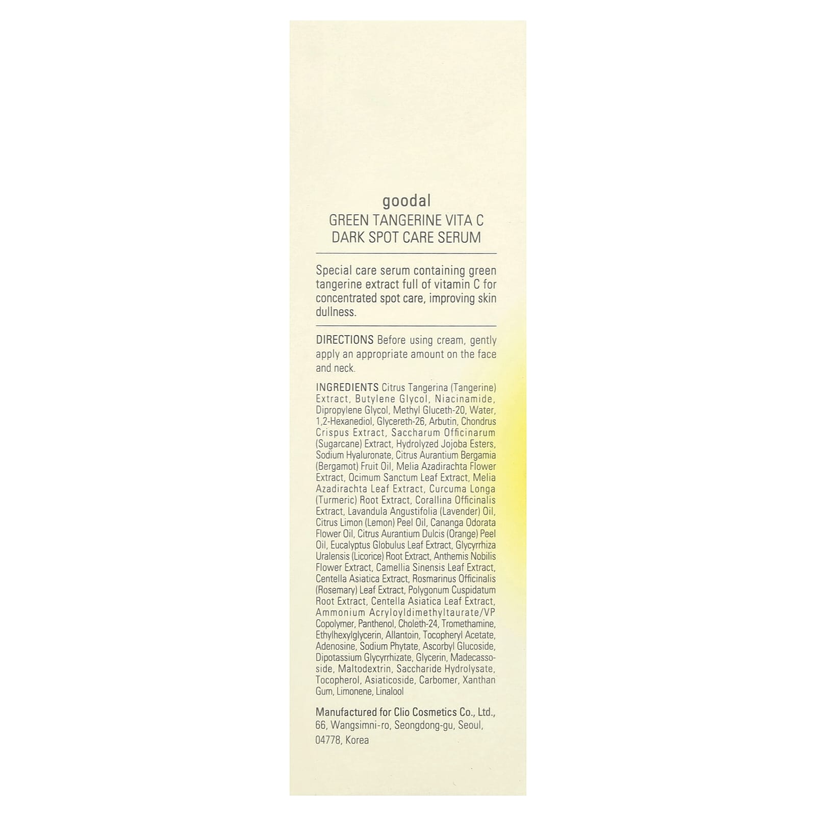 Экстракт мандарина (Citrus tangerina), бутиленгликоль, никотинамид, дипропиленгликоль, метил глюцет-20, вода, 1,2-гександиол, глицерет-26, арбутин, экстракт ирландского мха (Chondrus crispus), экстракт сахарного тростника (Saccharum officinarum), гидролизованные эфиры жожоба, гиалуронат натрия, масло бергамота (Citrus aurantium bergamia), экстракт цветков дерева ним (Melia azadirachta), экстракт листьев базилика священного (Ocimum sanctum), экстракт листьев дерева ним (Melia azadirachta), экстракт корня куркумы (Curcuma longa), экстракт кораллины лекарственной (Corallina officinalis), лавандовое масло (Lavandula angustifolia), масло из цедры лимона (Citrus limon), масло из цветков иланг-иланга (Cananga odorata), масло из цедры апельсина (Citrus aurantium dulcis), экстракт листьев эвкалипта шаровидного (Eucalyptus globulus), экстракт корня солодки (Glycyrrhiza uralensis), экстракт цветков ромашки римской (Anthemis nobilis), экстракт листьев зеленого чая (Camellia sinensis), экстракт готу колы (Centella asiatica), экстракт листьев розмарина (Rosmarinus officinalis), экстракт корня рейнутрии японской (Polygonum cuspidatum), экстракт листьев готу колы (Centella asiatica), аммоний акрилоилдиметилтаурат/ВП сополимер, пантенол, холет-24, трометамин, этилгексилглицерин, аллантоин, токоферилацетат, аденозин, фитат натрия, аскорбил глюкозид, дикалия глицирризат, глицерин, мадекассосид, мальтодекстрин, гидролизат сахаридов, токоферол, азиатикозид, карбомер, ксантановая камедь, лимонен, линалоол.
