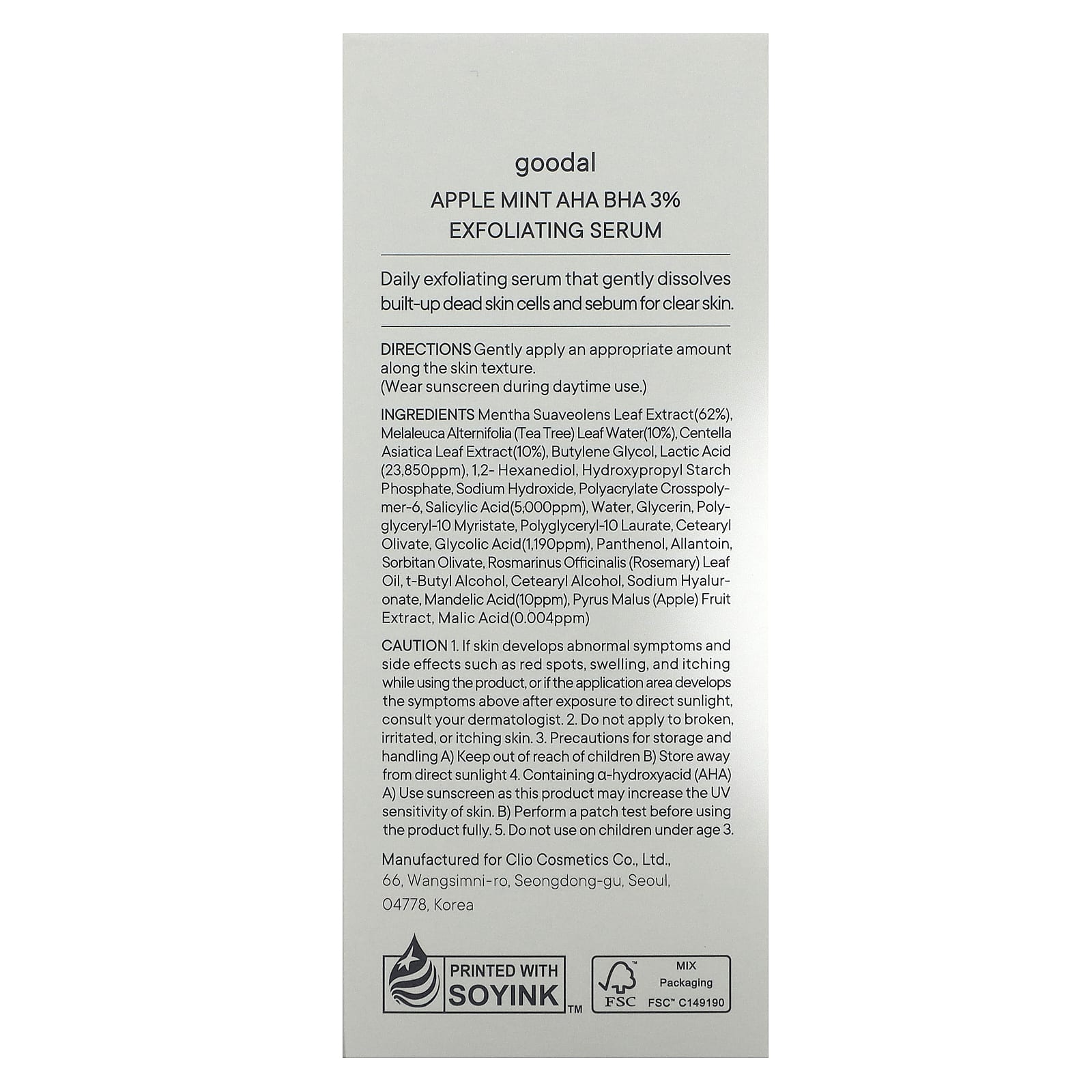 Экстракт листьев мяты круглолистной (Mentha suaveolens) (62%), вода из листьев чайного дерева (Melaleuca alternifolia) (10%), экстракт листьев готу колы (Centella asiatica) (10%), бутиленгликоль, молочная кислота (23 850 част./млн), 1,2-гександиол, гидроксипропил фосфат крахмала, гидроксид натрия, полиакрилата кроссполимер-6, салициловая кислота (5000 част./млн), вода, глицерин, полиглицерил-10 миристат, полиглицерил-10 лаурат, цетеарил оливат, гликолиевая кислота (1190 част./млн), пантенол, аллантоин, сорбитан оливат, масло из листьев розмарина (Rosmarinus officinalis), т-бутиловый спирт, цетеариловый спирт, гиалуронат натрия, миндальная кислота (10 част./млн), экстракт яблока (Pyrus malus), яблочная кислота (0,004 част./млн).