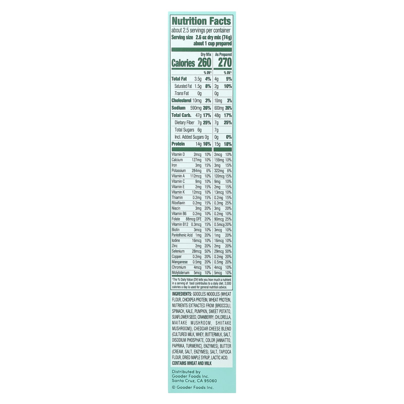 Лапша Goodles (пшеничная мука, протеин из нута, пшеничный протеин, питательные вещества, извлеченные из [брокколи, шпинат, кудрявая капуста, тыква, батат, семена подсолнечника, клюква, хлорелла, гриб майтаке, гриб шиитаке]), смесь сыров чеддер (кисломолочный, сыворотка, пахта, соль, динатрия фосфат, цвет [аннато, паприка, куркума], ферменты), масло (сливки, соль, ферменты), соль, тапиоковая мука, сушеный кленовый сироп, молочная кислота.