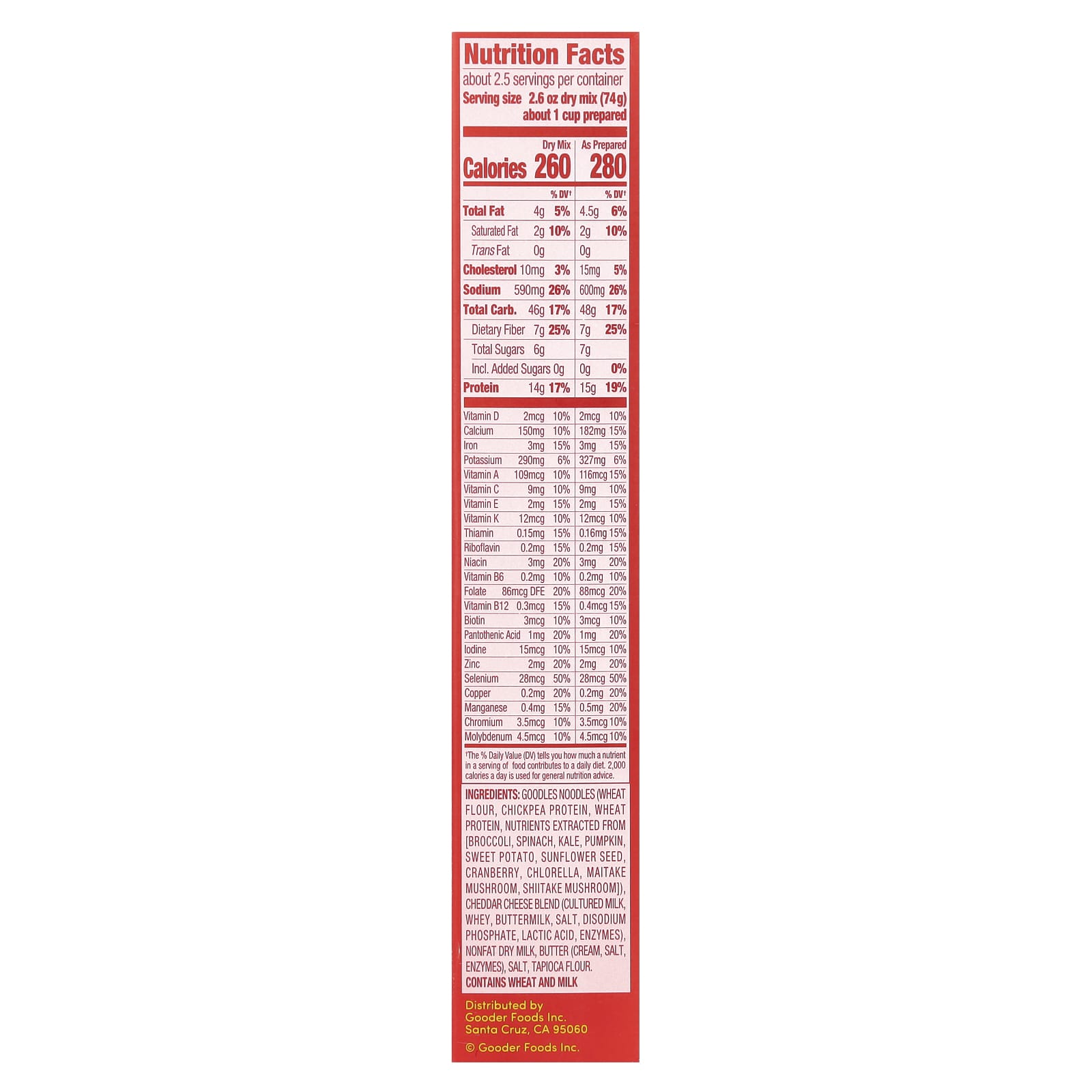 Лапша Goodles (пшеничная мука, протеин из нута, пшеничный протеин, питательные вещества, извлеченные из [брокколи, шпинат, кудрявая капуста, тыква, батат, семена подсолнечника, клюква, хлорелла, гриб майтаке, гриб шиитаке]), смесь сыров чеддер (кисломолочный, сыворотка, пахта, соль, динатрия фосфат, молочная кислота, ферменты), обезжиренное сухое молоко, масло (сливки, соль, ферменты), соль, тапиоковая мука.