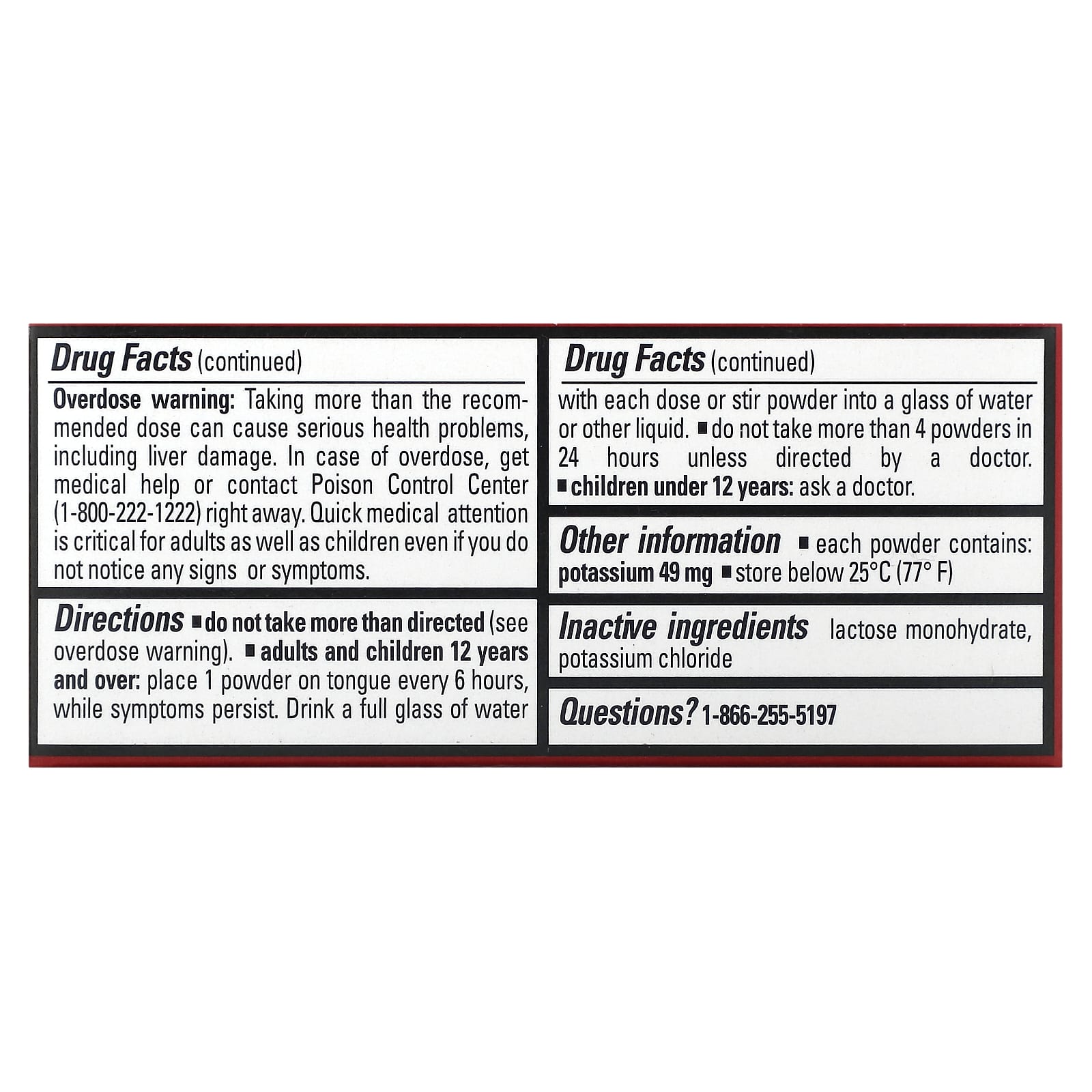 - Взрослым и детям старше 12 лет: принимать по 1 порошку на язык каждые 6 часов при сохранении симптомов. Выпивайте полный стакан воды с каждой дозой или размешайте порошок в стакане воды или другой жидкости.