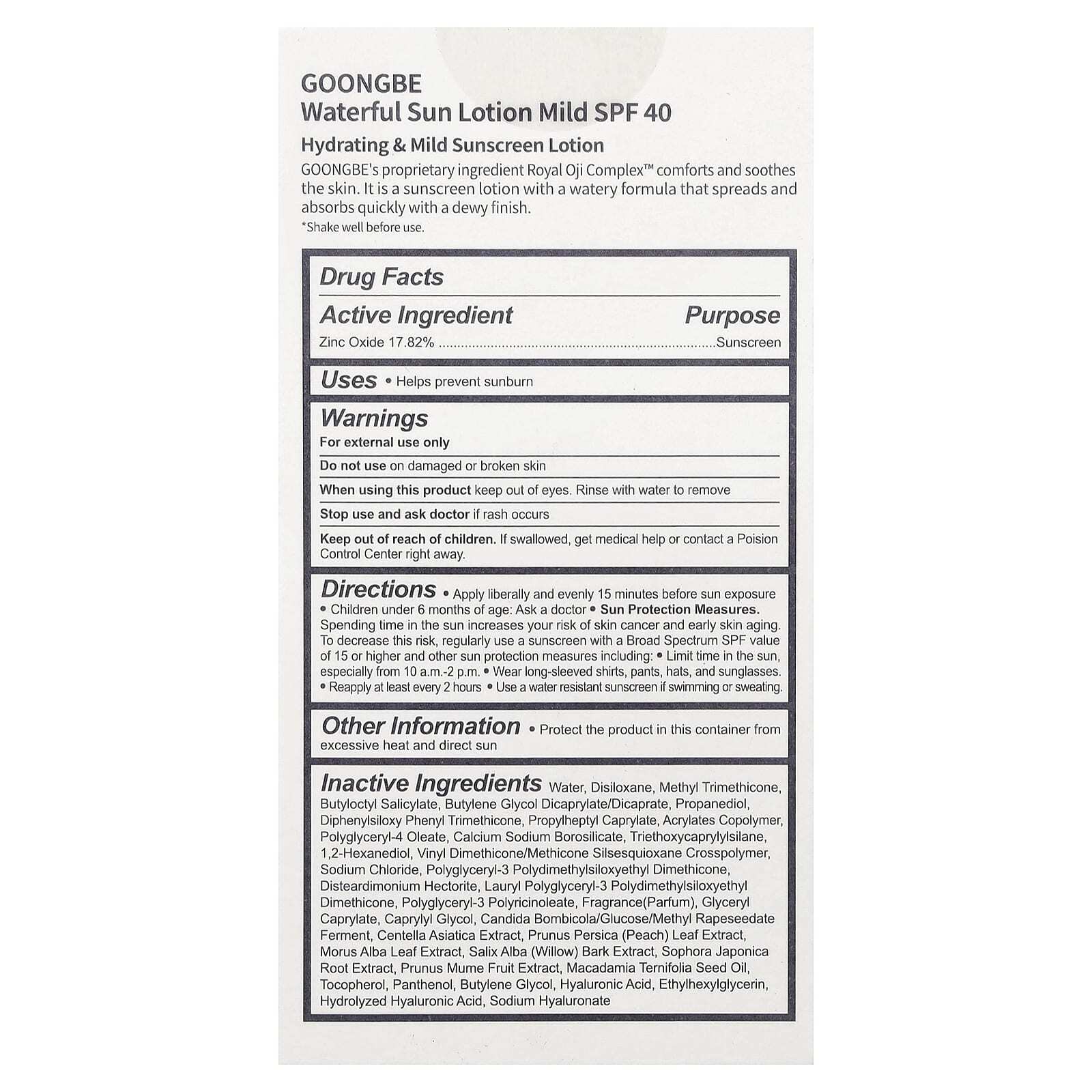 Запатентованный ингредиент Royal Oji Complex ™ от GOONGBE успокаивает кожу. Это солнцезащитный лосьон с водянистой формулой, который быстро растекается и впитывается с нежным послевкусием.