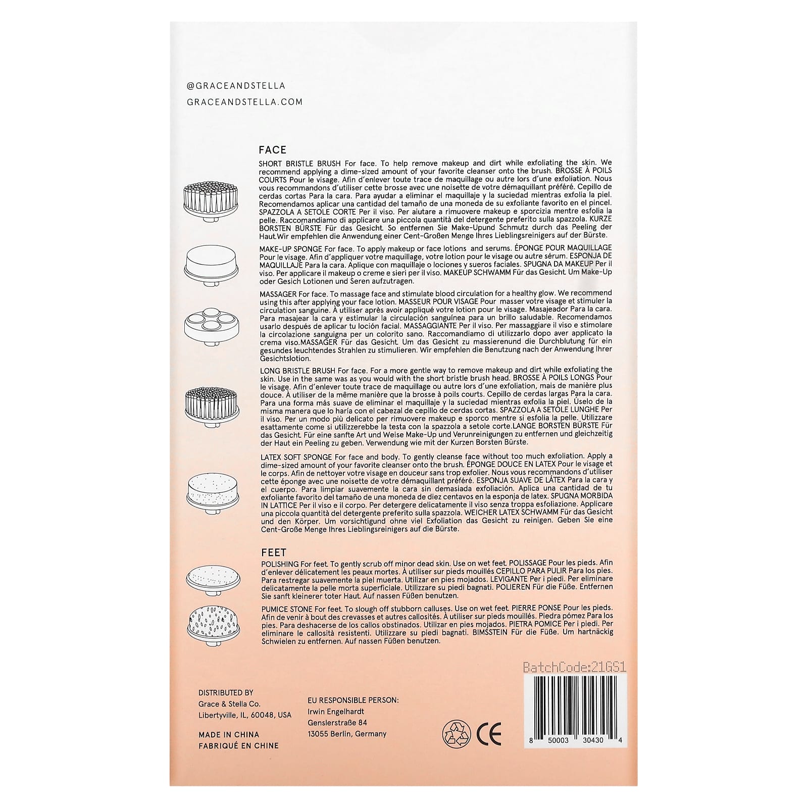В комплект входит: 1 устройство для ухода за лицом и 7 разных вращающихся насадок: шлифующая насадка, щетка с короткой щетиной, щетка с длинной щетиной, спонж для макияжа, мягкий латексный спонж, массажер и пемза.