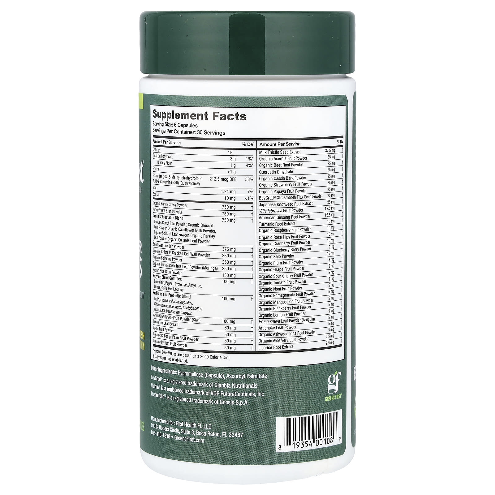 - Питает и поддерживает баланс всего организма. Капсулы Greens First® являются частью здорового рациона и ежедневно обеспечивают питательные вещества, которые вы, возможно, не получали бы иначе. Наша эксклюзивная формула восстанавливает и подщелачивает благодаря ежедневной порции питательных веществ.