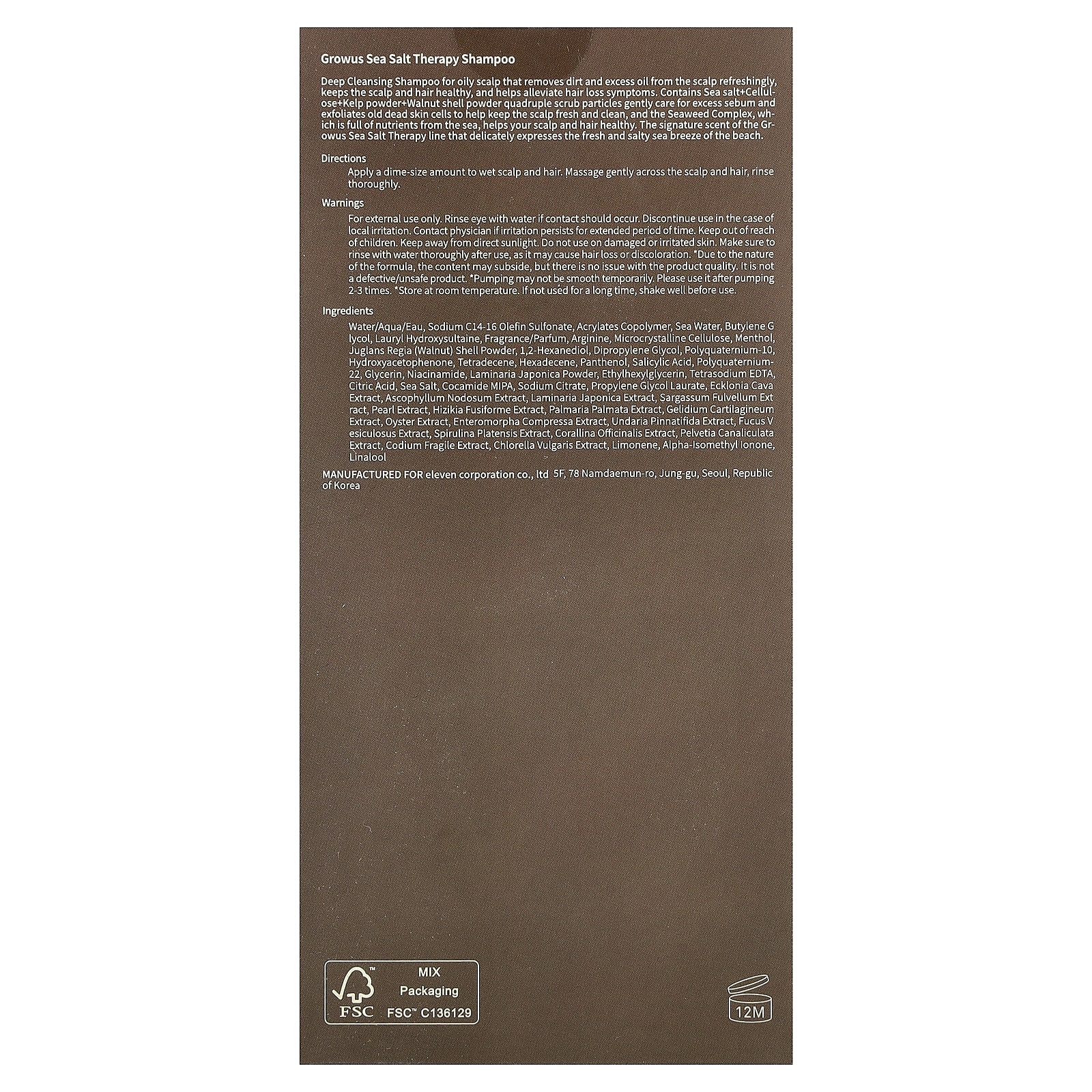 Шампунь для глубокого очищения жирной кожи головы, который освежает, удаляет загрязнения и излишки жира с кожи головы, поддерживает здоровье кожи головы и волос, а также помогает облегчить симптомы выпадения волос. Содержит морскую соль, целлюлозу, порошок из бурых водорослей, порошок из скорлупы грецкого ореха и счетверенные частицы скраба, которые бережно удаляют излишки кожного жира и отшелушивают старые омертвевшие клетки кожи, помогая сохранять свежесть и чистоту кожи головы. Комплекс из морских водорослей, богатый питательными веществами из моря, помогает вашей кожи головы и волос. Фирменный аромат линейки продуктов Growus Sea Salt Therapy с изысканной свежестью и соленым морским бризом на солнце.