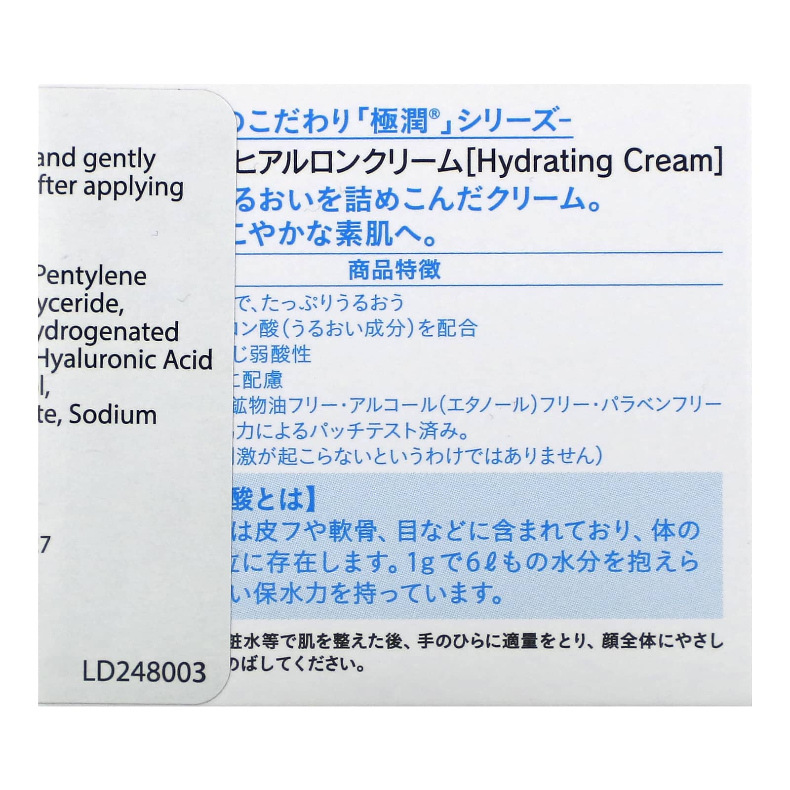 Вода, глицерин, дипропиленгликоль, диглицерин, пентилен гликоль, бегениловый спирт, бутиленгликоль, каприловый/каприновый триглицерид, карбомер, диметикон, двунатриевая ЭДТК, глицерил стеарат, гидрогенизированный поли(c6-12 олефин), гидролизованная гиалуроновая кислота, фильтрат фермента лактококка/гиалуроновой кислоты, ПЭГ-20 сорбитан изостеарат, феноксиэтанол, фитостерил/октилдодецил лаурил глютамат, бензоат натрия, гиалуронат натрия, стеариловый спирт, триэтаноламина.