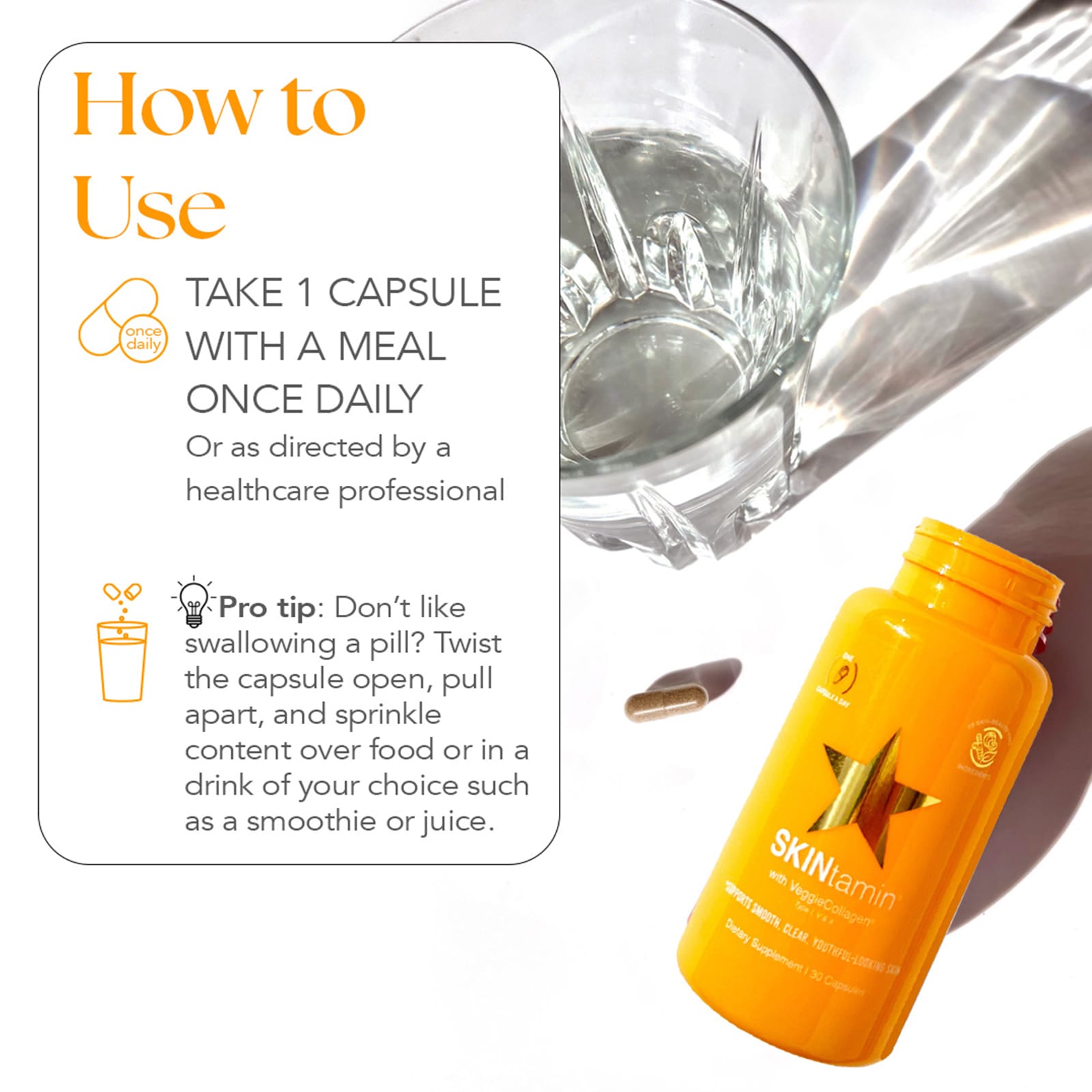 SKINtamin® - это комплексная формула для красоты кожи, которую можно принимать один раз в день, содержит 22 натуральных ингредиента, включая органические плоды амлы, экстракт шафрана, ресвератрол, витамины A, C, E, B12, цинк, гиалуроновую кислоту и наш запатентованный VeggieCollagen® (тип I, V). & X) для гладкой, чистой и молодой кожи изнутри.