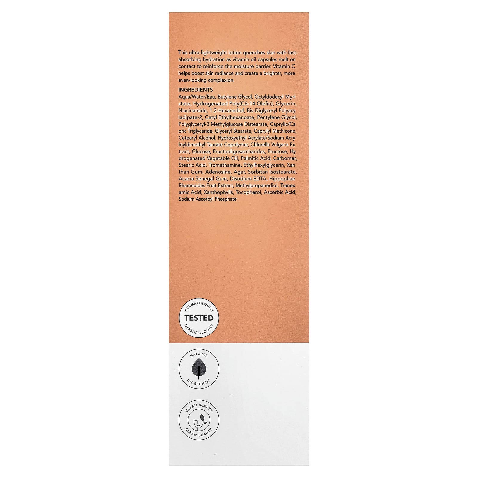 Этот сверхлегкий лосьон увлажняет кожу, быстро впитывая влагу, а капсулы с витаминным маслом тают при контакте, укрепляя влагоудерживающий барьер. Витамин C помогает усилить сияние кожи и сделать цвет лица более ярким и ровным.
