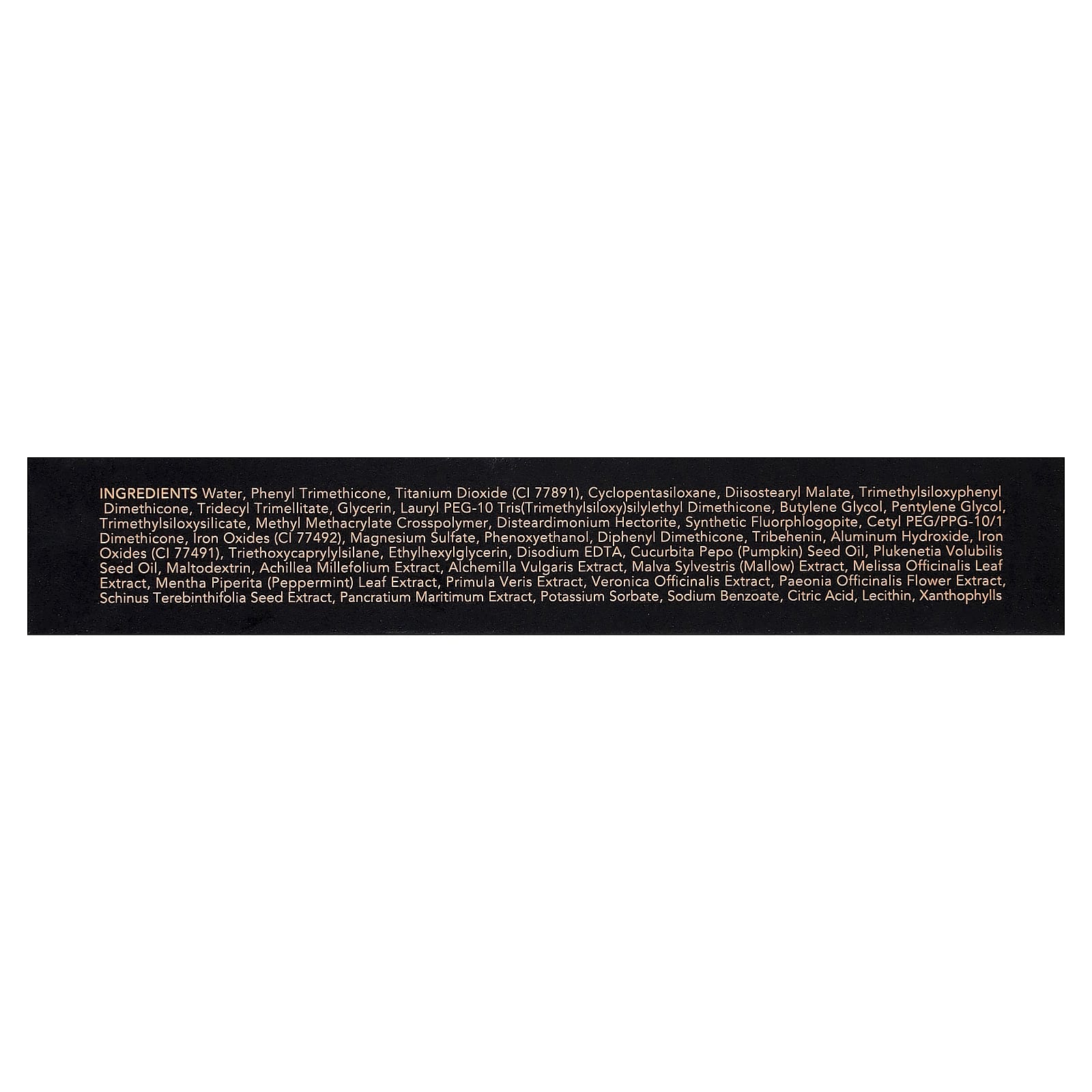 Вода, фенилтриметикон, диоксид титана (CI 77891), циклопентасилоксан, диизостеарил малат, триметилсилоксифенил диметикон, тридецил тримеллитат, глицерин, лаурил ПЭГ-10 трис(триметилсилокси)силилэтил диметикон, бутиленгликоль, пентилен гликоль, триметилсилоксисиликат, метил метакрилат кроссполимер, дистеардимония гекторит, синтетический фторфлогопит, цетил ПЭГ/ППГ-10/1 диметикон, оксиды железа (CI 77492), сульфат магния, феноксиэтанол, дифенил диметикон, трибехенин, гидроксид алюминия, оксиды железа (CI 77491), триэтоксикаприлилсилан, этилгексилглицерин, двунатриевая ЭДТК, масло семян тыквы (Cucurbita pepo), масло из семян плюкенетии (Plukenetia volubilis), мальтодекстрин, экстракт тысячелистника (Achillea millefolium), экстракт манжетки обыкновенной (Alchemilla vulgaris), экстракт мальвы (Malva sylvestris), экстракт листьев мелиссы лекарственной (Melissa officinalis), экстракт листьев перечной мяты (Mentha piperita), экстракт первоцвета весеннего (Primula veris), экстракт вероники лекарственной (Veronica officinalis), экстракт цветков пиона (Paeonia officinalis), экстракт семян стинуса стелющегося (Schinus terebinthifolia), экстракт панкрация морского (Pancratium maritimum), сорбат калия, бензоат натрия, лимонная кислота, лецитин, ксантофиллы.
