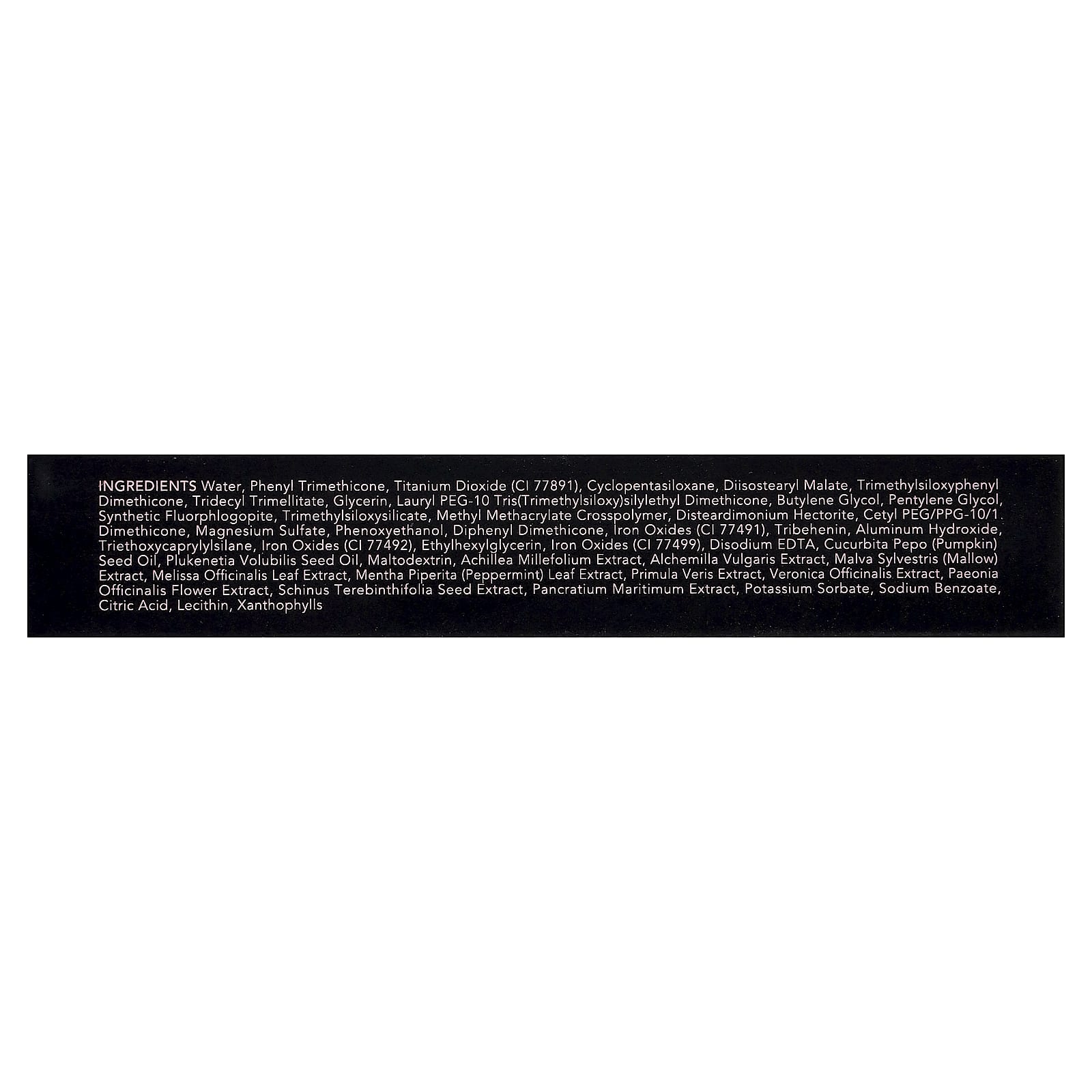 Вода, фенилтриметикон, диоксид титана (CI 77891), циклопентасилоксан, диизостеарил малат, триметилсилоксифенил диметикон, тридецил тримеллитат, глицерин, лаурил ПЭГ-10 трис(триметилсилокси)силилэтил диметикон, бутиленгликоль, пентилен гликоль, синтетический фторфлогопит, триметилсилоксисиликат, метил метакрилат кроссполимер, дистеардимония гекторит, цетил ПЭГ/ППГ-10/1. диметикон, сульфат магния, феноксиэтанол, дифенил диметикон, оксиды железа (CI 77491), трибехенин, гидроксид алюминия, триэтоксикаприлилсилан, оксиды железа (CI 77492), этилгексилглицерин, оксиды железа (CI 77499), двунатриевая ЭДТК, масло семян тыквы (Cucurbita pepo), масло из семян плюкенетии (Plukenetia volubilis), мальтодекстрин, экстракт тысячелистника (Achillea millefolium), экстракт манжетки обыкновенной (Alchemilla vulgaris), экстракт мальвы (Malva sylvestris), экстракт листьев мелиссы лекарственной (Melissa officinalis), экстракт листьев перечной мяты (Mentha piperita), экстракт первоцвета весеннего (Primula veris), экстракт вероники лекарственной (Veronica officinalis), экстракт цветков пиона (Paeonia officinalis), экстракт семян стинуса стелющегося (Schinus terebinthifolia), экстракт панкрация морского (Pancratium maritimum), сорбат калия, бензоат натрия, лимонная кислота, лецитин, ксантофиллы.