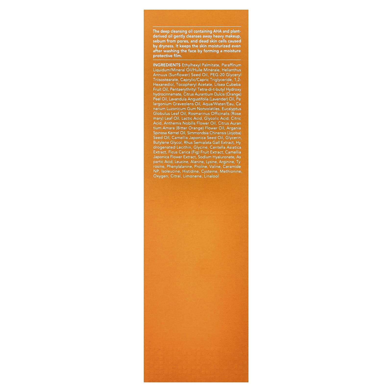 Этилгексил пальмитат, вазелиновое масло/минеральное масло, подсолнечное масло (Helianthus annuus), ПЭГ-20 глицерил триизостеарат, каприловый/каприновый триглицерид, 1,2-гександиол, токоферилацетат, масло плодов лицеи кубебы (Litsea cubeba), пентаэритритил тетра-ди-трет-бутил гидрокси гидроциннамат, масло из цедры апельсина (Citrus aurantium dulcis), лавандовое масло (Lavandula angustifolia), масло пеларгонии (Pelargonium graveolens), вода (Aqua/eau), слаболетучая камедь элеми (Canarium luzonicum), масло из листьев эвкалипта шаровидного (Eucalyptus globulus), масло из листьев розмарина (Rosmarinus officinalis), молочная кислота, гликолевая кислота, лимонная кислота, масло цветков ромашки английской (Anthemis nobilis), масло из цветков горького апельсина (Citrus aurantium amara), аргановое масло (Argania spinosa), масло из семян жожоба (Simmondsia chinensis), масло из семян камелии японской (Camellia japonica), глицерин, бутиленгликоль, экстракт сумаха китайского (Rhus semialata), гидрогенизированный лецитин, глицин, экстракт готу колы (Centella asiatica), экстракт плодов инжира (Ficus carica), экстракт цветков камелии японской (Camellia japonica), гиалуронат натрия, аспарагиновая кислота, лейцин, аланин, лизин, аргинин, тирозин, фенилаланин, пролин, валин, керамид NP, изолейцин, гистидин, цистеин, метионина, кислородом, цитраль, лимонен, линалоол.