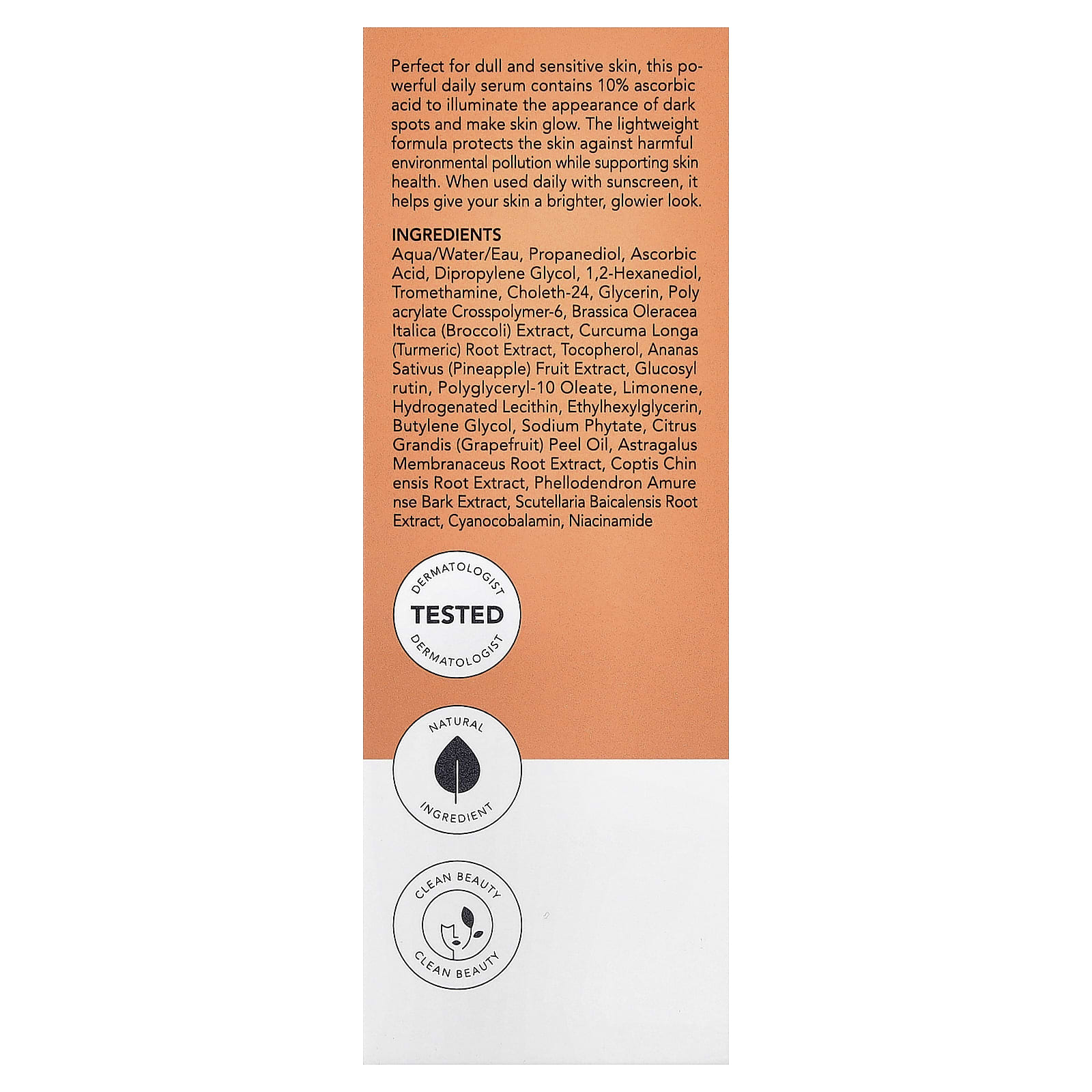 Эта эффективная сыворотка для ежедневного использования идеально подходит для тусклой и чувствительной кожи. Она содержит 10% аскорбиновую кислоту, которая осветляет темные пятна и придает коже сияние. Легкая формула защищает кожу от вредных загрязнений из окружающей среды, поддерживая здоровье кожи. При ежедневном использовании с солнцезащитным средством ваша кожа становится более яркой и сияющей.