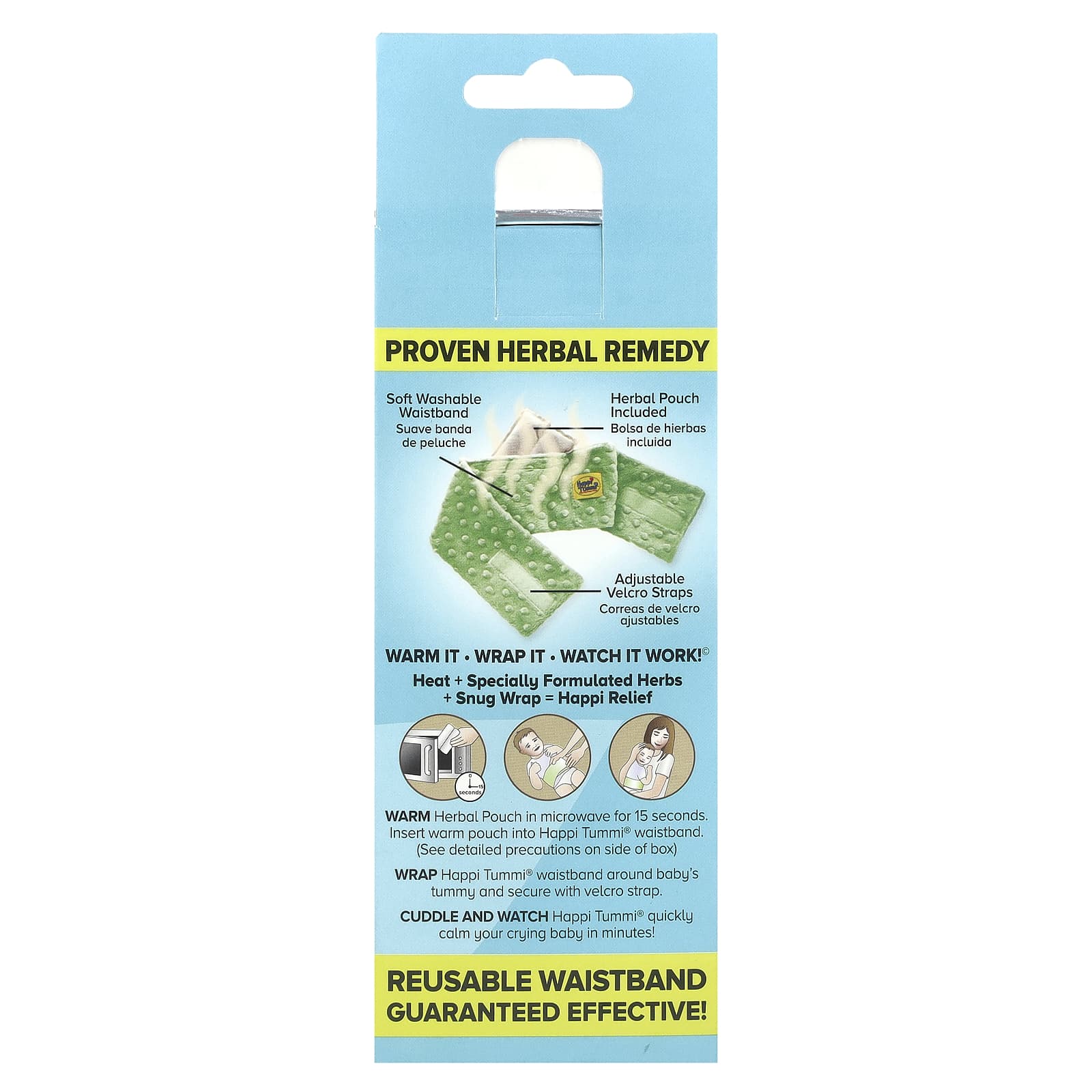 Разогрейте пакетик с травами в микроволновой печи в течение 15 секунд. Вставьте теплый мешочек в пояс Happi Tummi®. (См. Подробные меры предосторожности на упаковке)