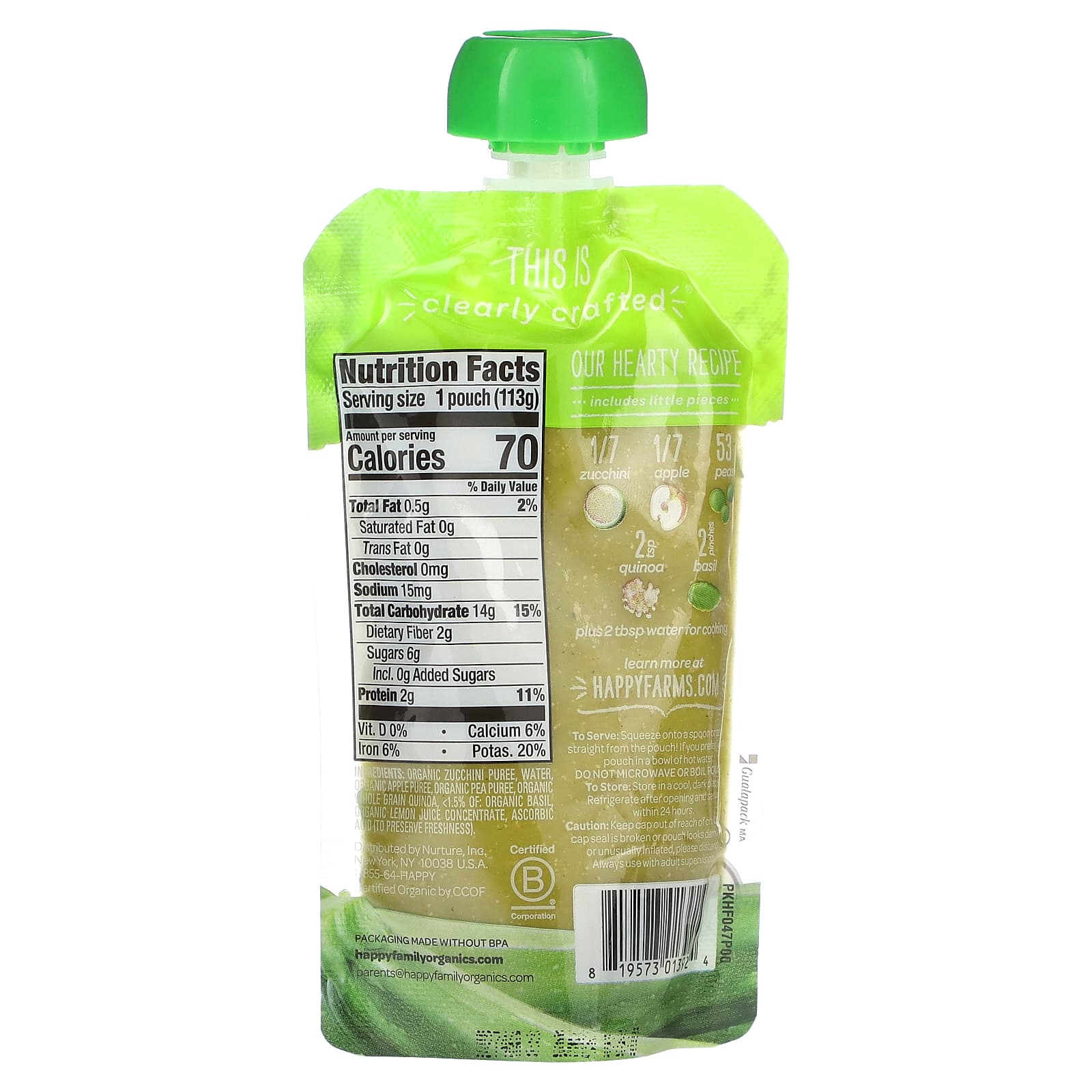 Пюре из органических кабачков, вода, органическое яблочное пюре, органическое гороховое пюре, органическая киноа из дырчатого зерна, & amp; lt; 1,5%: органический базилик, концентрат органического лимонного сока, аскорбиновая кислота (для сохранения свежести).