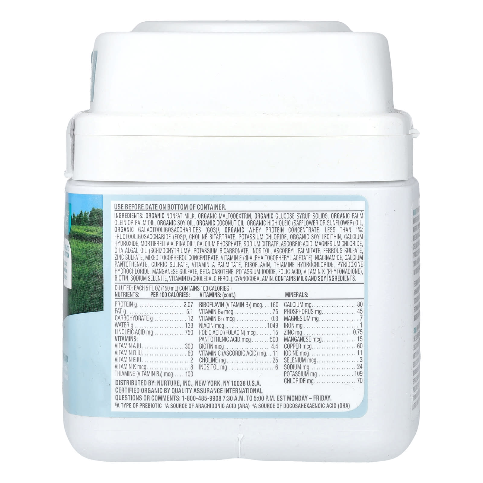 Органическое обезжиренное молоко, органический мальтодекстрин, органические твердые вещества глюкозного сиропа, органический пальмовый олеин или пальмовое масло, органическое соевое масло, органическое кокосовое масло, органическое высокоолеиновое (сафлоровое или подсолнечное) масло, органические галактоолигосахариды (ГОС)§, органический концентрат сывороточного протеина, менее 1%: фруктоолигосахариды (ФОС)§, битартрат холина, хлорид калия, органический лецитин из сои, гидроксид кальция, масло одноклеточных грибов Mortierella alpina†, фосфат кальция, цитрат натрия, аскорбиновая кислота, хлорид магния, ДГК из масла водорослей (Schizochytrium)‡, бикарбонат калия, инозитол, аскорбил пальмитат, сульфат железа, сульфат цинка, концентрат смешанных токоферолов, витамин E (в виде dl-альфа токоферилацетата), никотинамид, пантотенат кальция, сульфат меди, витамин A пальмитат, рибофлавин, гидрохлорид тиамина, гидрохлорид пиридоксина, сульфат марганца, бета-каротин, йодид калия, фолиевая кислота, витамин K (фитонадион), биотин, селенит натрия, витамин D (холекальциферол), цианокобаламин.