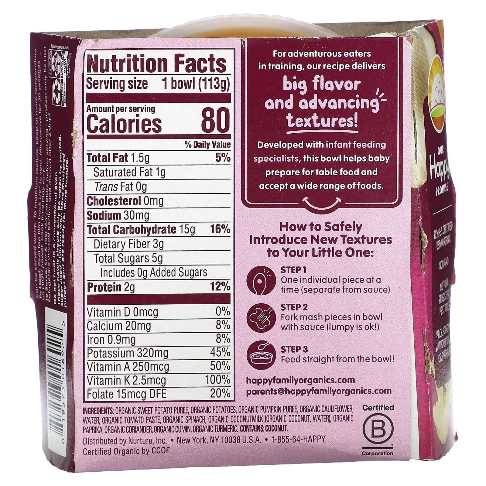 Органическое пюре из батата, органический картофель, органическое тыквенное пюре, органической цветной капусты, вода, органическая томатная паста, органический шпинат, органическое кокосовое молоко, вода), органическая паприка, органический кориандр, органическая зира, органическая куркума.