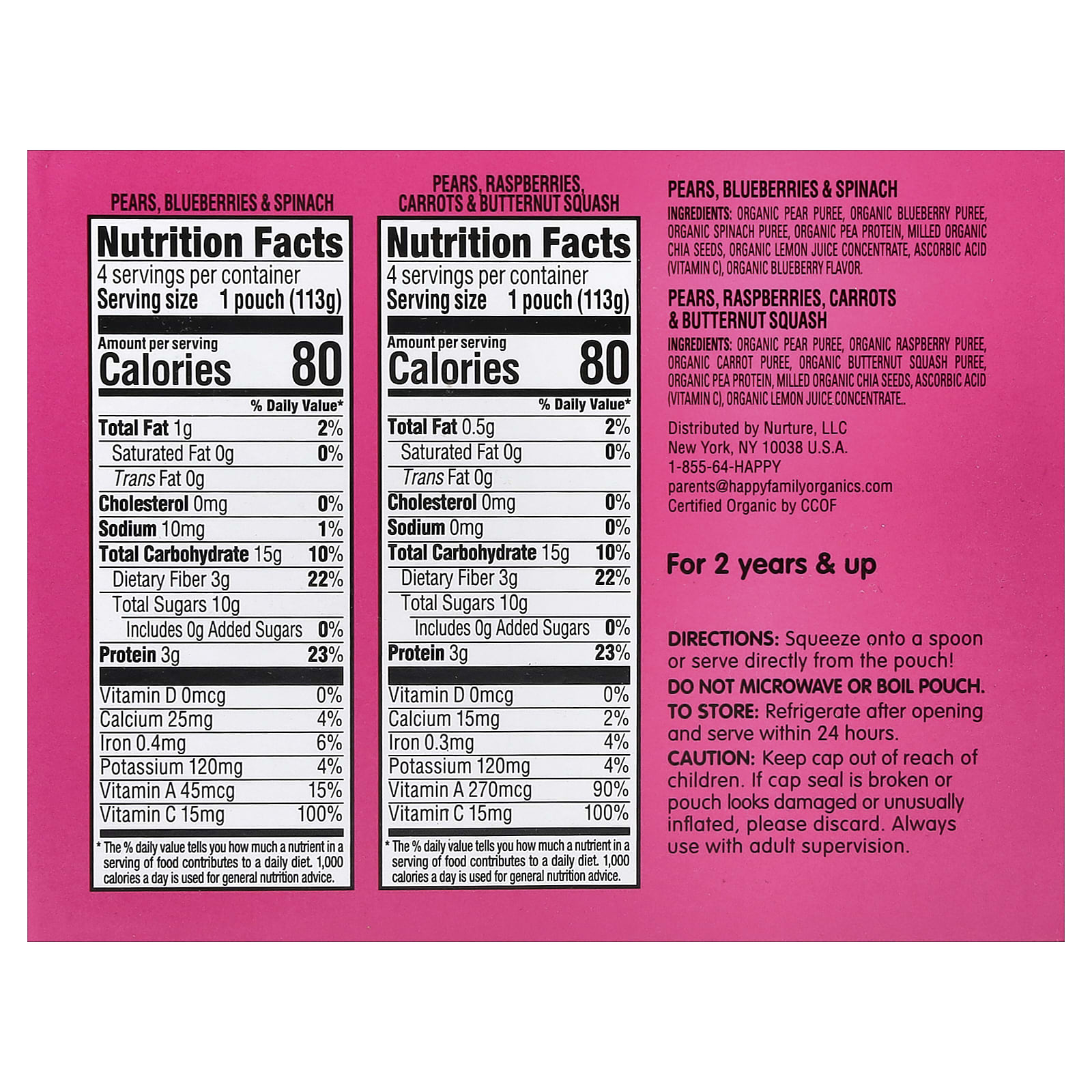 Груши, Малина, Морковь и Ингредиенты для мускатной тыквы: Органическое грушевое пюре, пюре из органической малины, пюре из органической моркови, пюре из органической мускатной тыквы, органический гороховый протеин, измельченные органические семена чиа, аскорбиновая кислота (витамин C), концентрат органического лимонного сока.
