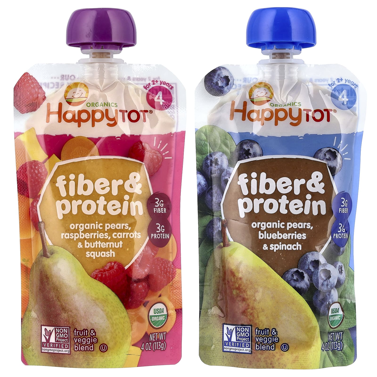 Груши, голубика и Ингредиенты из шпината: Органическое грушевое пюре, пюре из органической черники, пюре из органического шпината, органический гороховый протеин, измельченные органические семена чиа, концентрат органического лимонного сока, аскорбиновая кислота (витамин C), органический ароматизатор «Голубика».