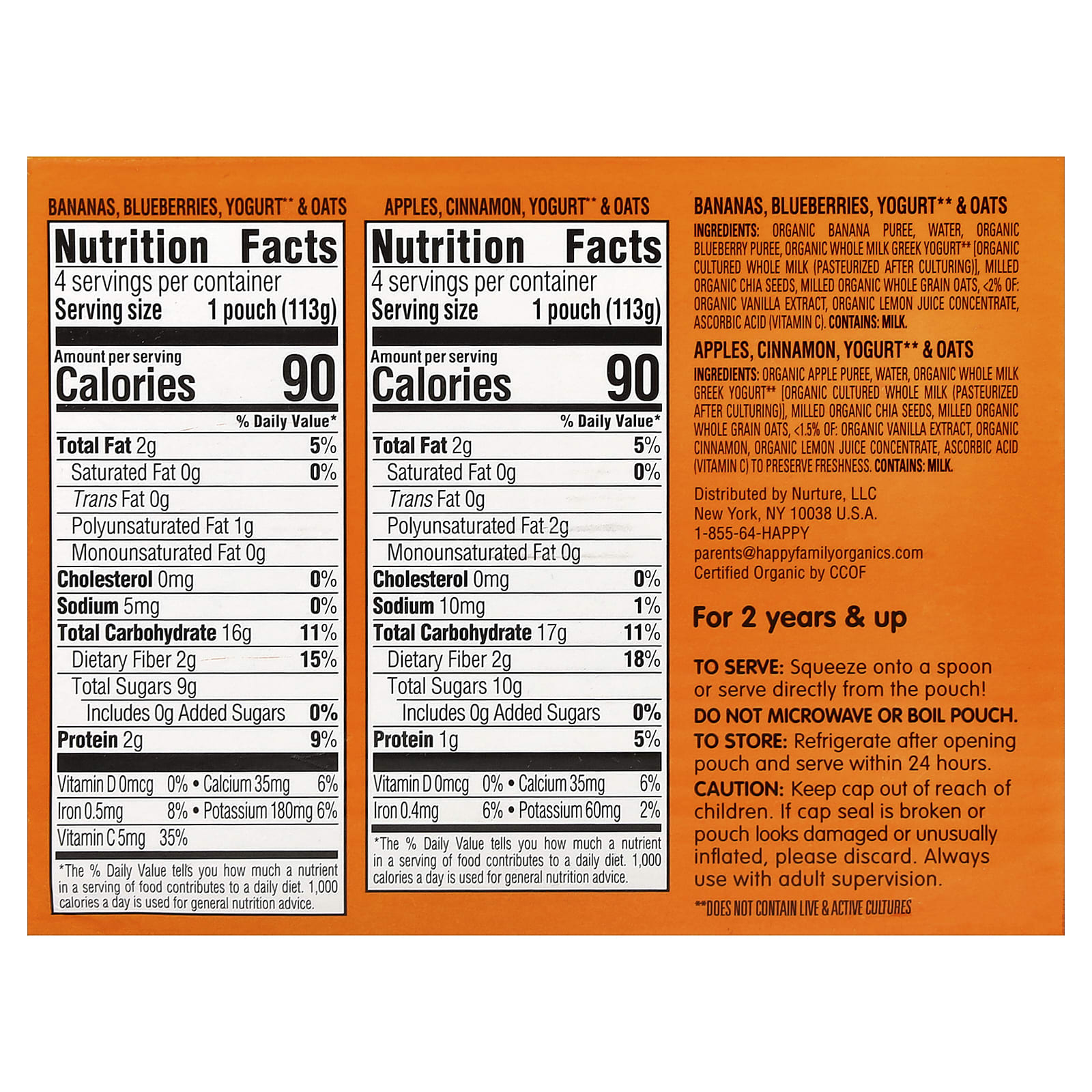 Органическое банановое пюре, вода, пюре из органической черники, греческий йогурт из органического цельного молока** [органический кисло-молочный продукт (пастеризованный после культивирования)], измельченные органические семена чиа, измельченный органический цельнозерновой овес, < 2%: органический экстракт ванили, концентрат органического лимонного сока, аскорбиновая кислота (витамин С).