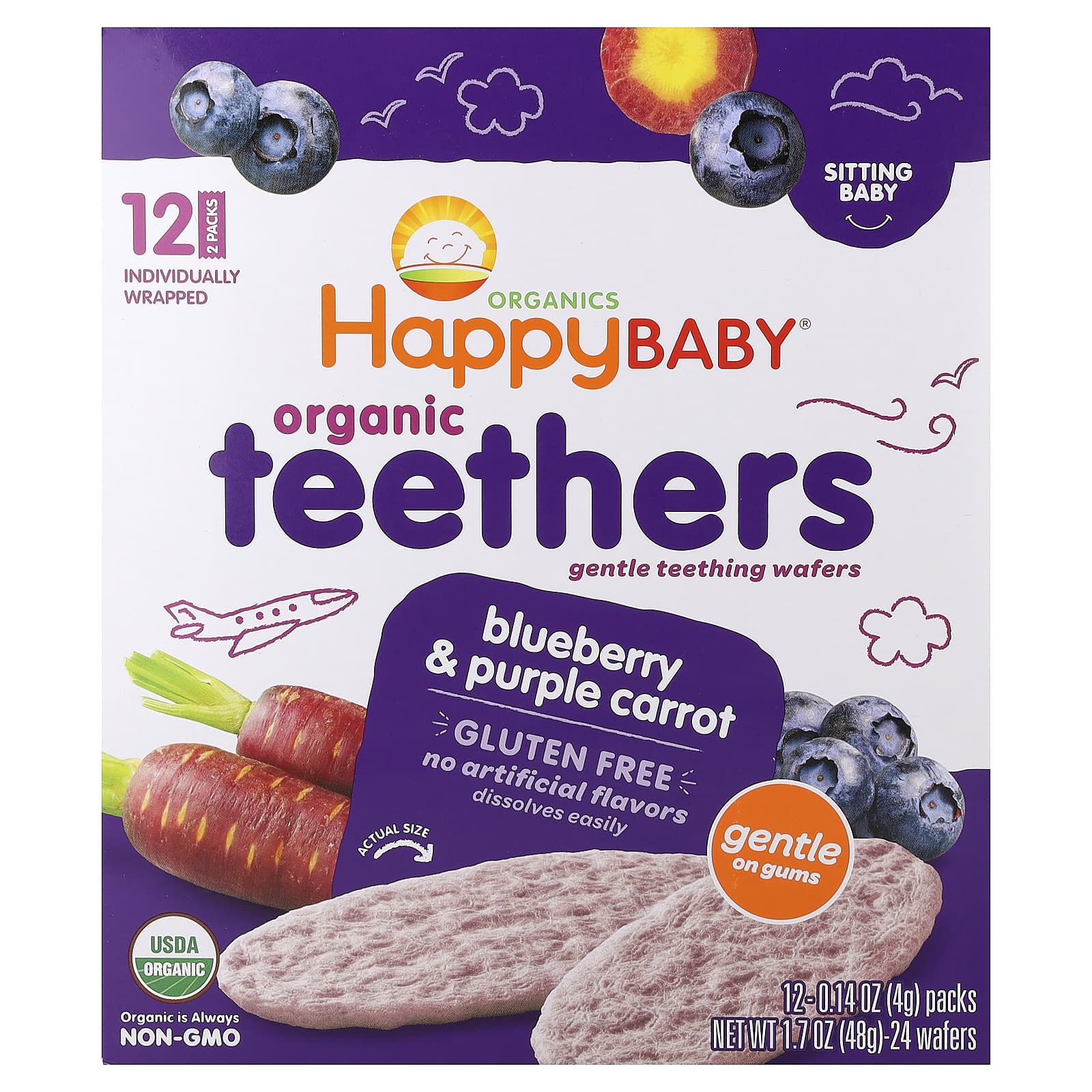 Happy Family Organics, Happy Baby®, органические вафли для прорезывания зубов, голубика и фиолетовая морковь, 12 пакетиков по 4 г (0,14 унции)