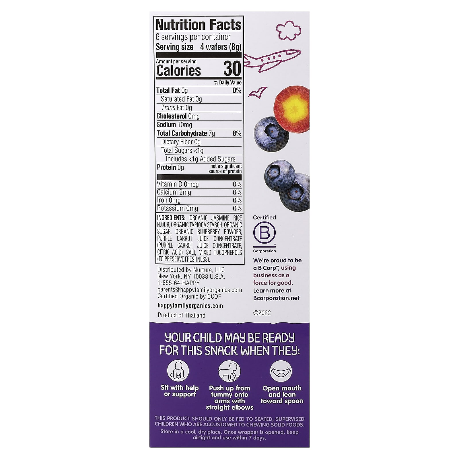 Мука из органического риса жасмин, органический тапиоковый крахмал, органический сахар, порошок из органической голубики, концентрат сока фиолетовой моркови (концентрат сока фиолетовой моркови, лимонная кислота), соль, смешанные токоферолы (для сохранения свежести).