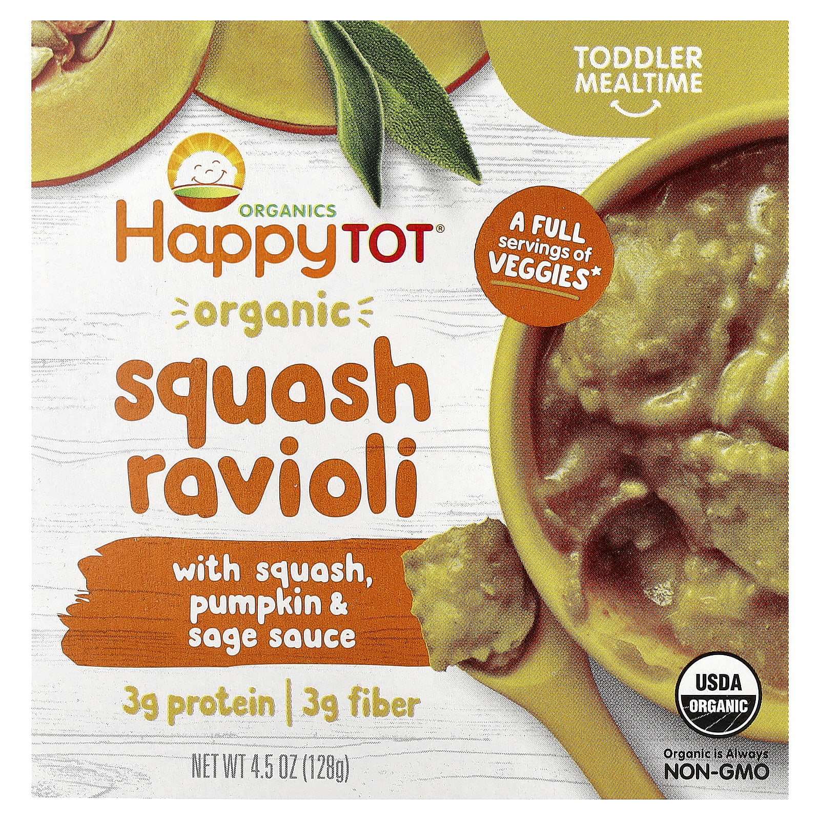 Органический соус - пюре из мускатной тыквы*, Вода, тыквенное пюре*, яблочное пюре*, соль, молотый шалфей*, луковый порошок*], органические равиоли и мука из цельных сортов пшеницы*, Вода, пюре из мускатной тыквы*, хлебные крошки*, (пшеничная мука*, Вода, дрожжи, соль), кукурузный крахмал*, живой пшеничный глютен*, дижонская горчица* (дистиллированный уксус*, Вода, семена горчицы*, соль, специи*), соль, специи*".