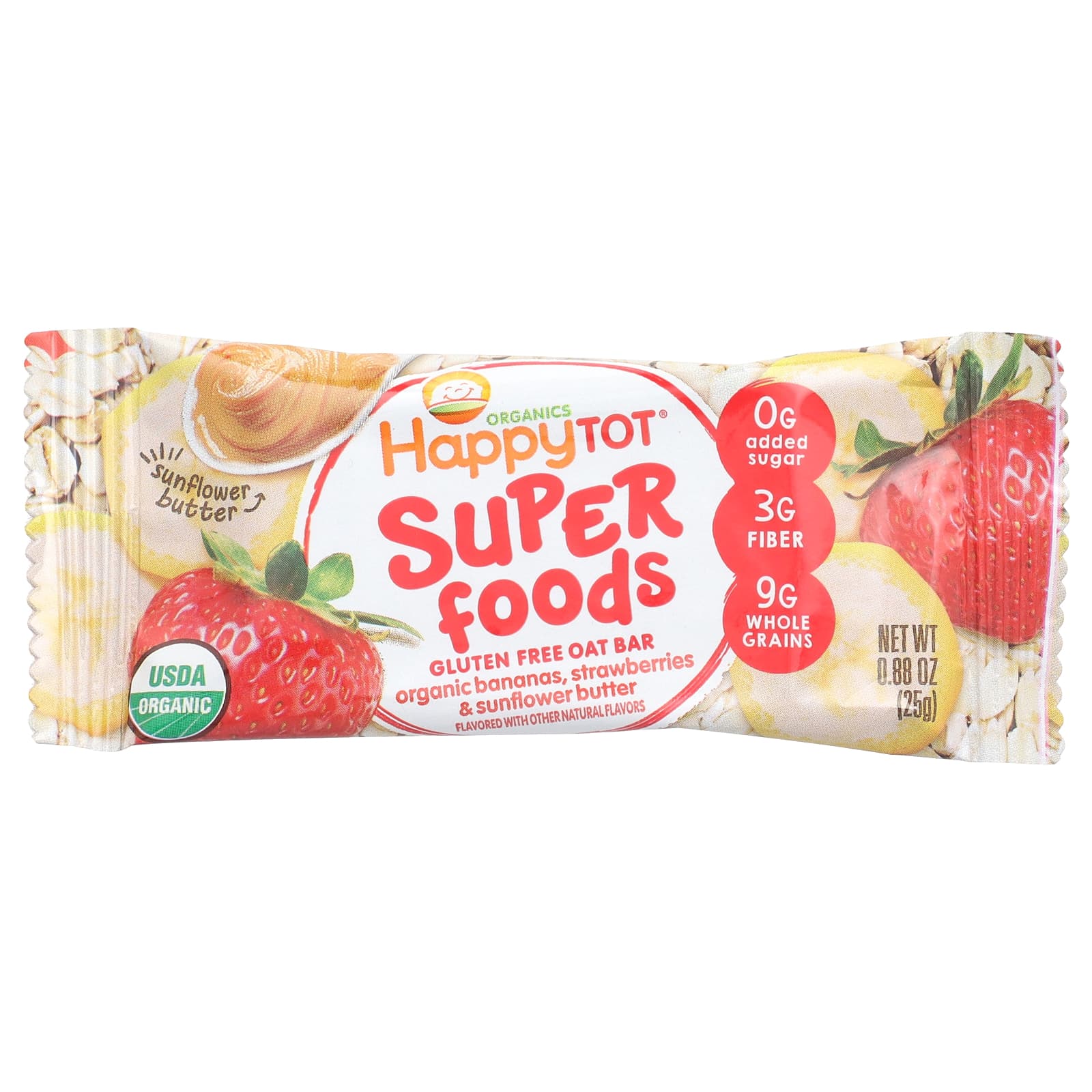 Органическая финиковая паста, органический цельнозерновой овес,, органическое подсолнечное масло, чипсы из органического цельнозернового бурого риса, органический растительный глицерин, органическое клубничное пюре, органический инулин агавы, органические сушеные бананы, < 1%: органических натуральных ароматизаторов, пищевая сода, экстракт органического розмарина