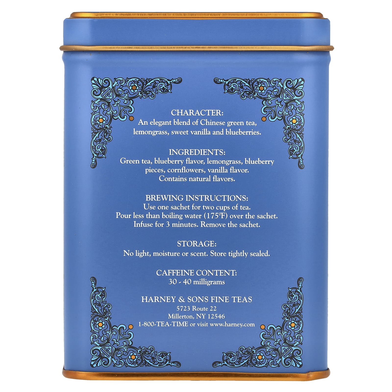Зеленый чай, лимонная трава, кусочки черники, васильки и натуральные ароматизаторы.