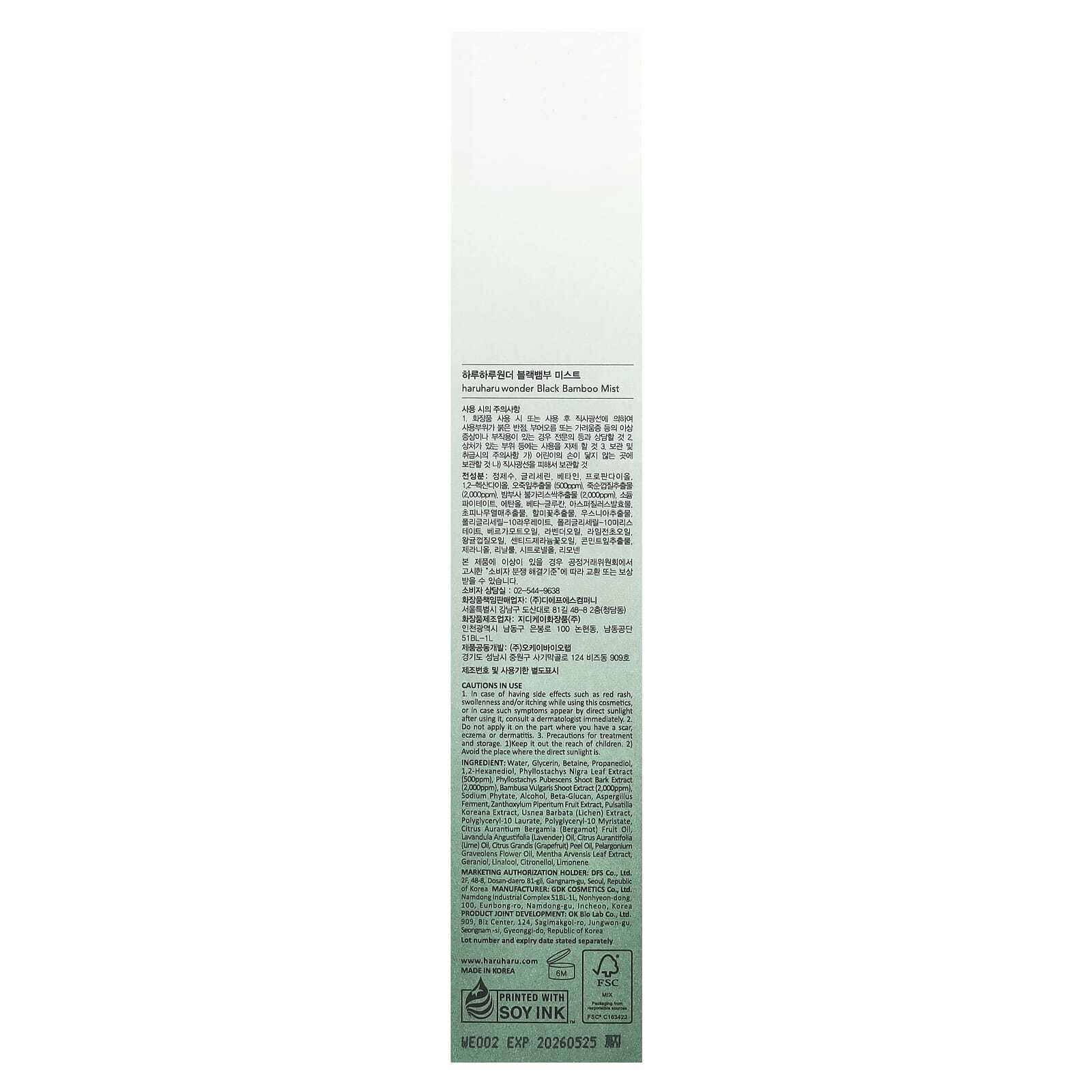 haruharu wonder Black Bamboo Mist - это чистая смесь натурально ферментированной коры бамбуковых побегов и экстрактов листьев черного бамбука. Обеспечивает ежедневное насыщение антиоксидантами вашего лица для усиленной защиты